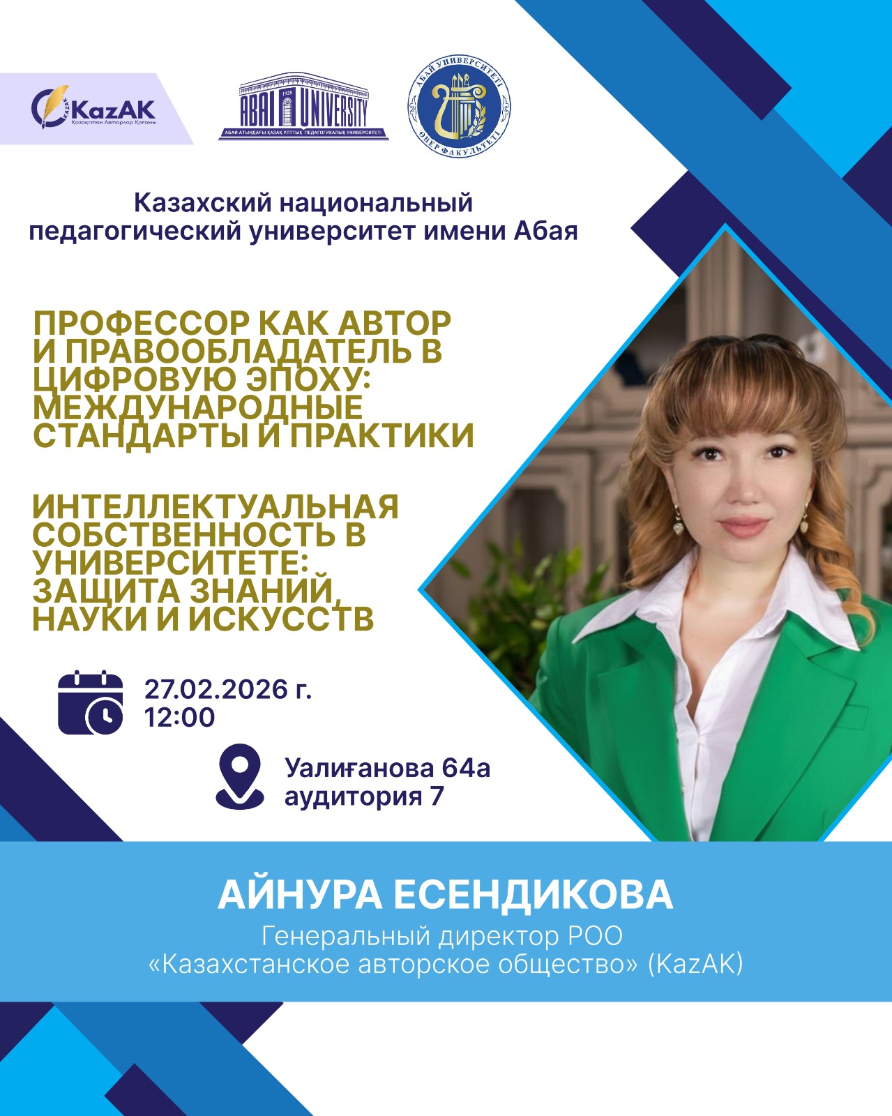 Кездесудің спикері - Айнура Есендикова, Қазақстандық авторлық қоғам (KazAK) РҚБ Бас директоры. Ол университеттегі зияткерлік меншік мәдениетін қалыптастыру, авторлардың құқықтарын қорғау және цифрлық кеңістікте туындайтын құқықтық тәуекелдердің алдын алу мәселелері бойынша кәсіби пікірін білдірді.