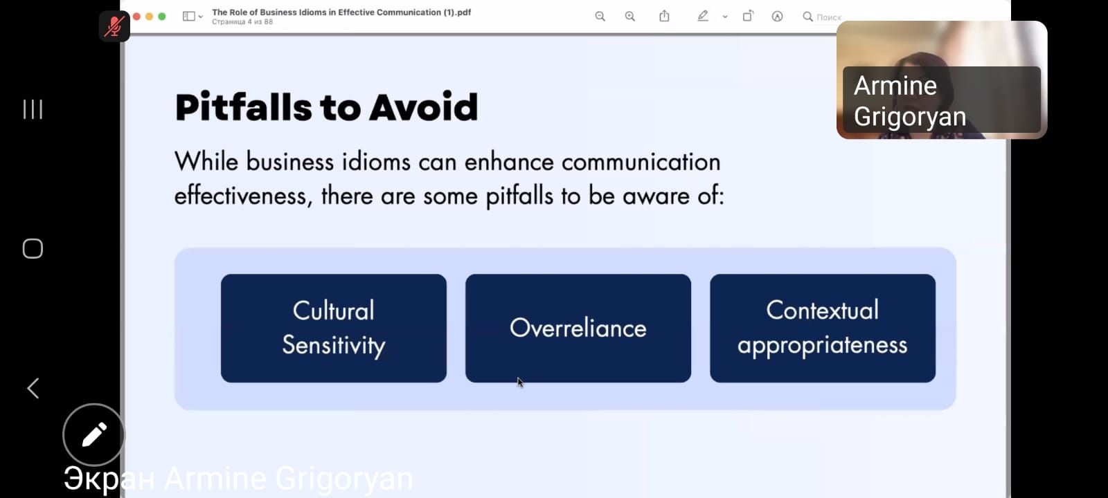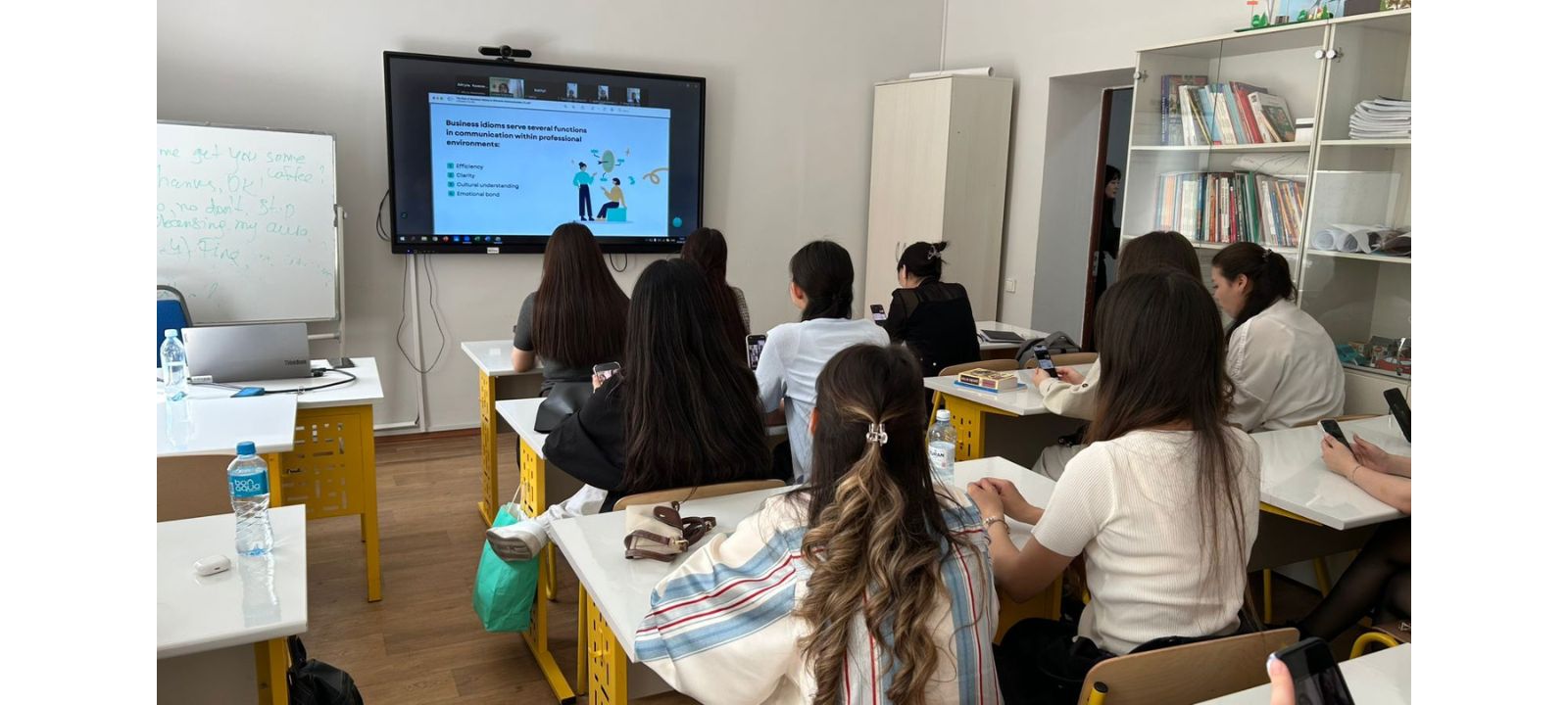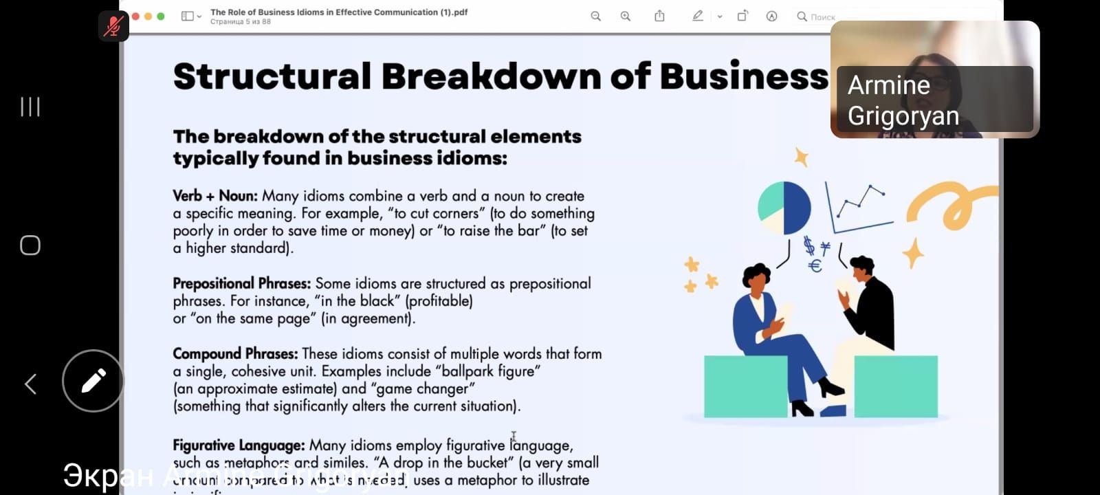 Особенности перевода бизнес-идиом в англоязычном экономическом дискурсе В рамках декады науки Григорян Армине Эдуардовна – старший преподаватель, преподаватель-исследователь кафедры иностранных языков №2, Высшей школы социально-гуманитарных наук Российского экономического университета имени Г. В. Плеханова, выступила с лекцией на английском языке «Особенности перевода бизнес-идиом в англоязычном экономическом дискурсе» для студентов и магистрантов Казахского Национального Педагогического Университета им. Абая. В ходе лекции лектор рассказала о важности использования деловых идиом в профессиональной коммуникации, о роли данных идиоматических выражений в процессе решения деловых вопросов, об их эффективности для достижения профессиональных задач. Обсуждались вопросы происхождения и эволюции деловых идиом, были продемонстрированы их правильные переводы с английского языка на русский, были приведены ключевые аспекты структурного анализа идиом. Армине Эдуардовна дала классификацию идиом в зависимости от конкретных аспектов бизнеса, к которым они относятся. Отметила важность понимания этих категорий для определения и дальнейшего их использования в различных профессиональных контекстах. Студенты продемонстрировали заинтересованность и задавали разные вопросы по данной теме. В конце лекции им было предложено пройти маленький тест по пройденной теме.