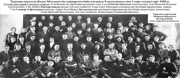 В организации первого вуза Казахстана огромную роль сыграл выдающийся государственный деятель, талантливый ученый и педагог Санжар Асфендияров, стоявший у колыбели высшей школы и науки республики. С.Д.Асфендияров, свободно владеющий арабским, персидским, английским и французским языками, был и умелым управленцем. Он возглавил организационно-методическую работу вуза и принял первых студентов. Внес неоценимый вклад в формирование учебно-материальной базы учебного заведения, в обеспечение учебниками, в подбор преподавателей. Позднее работал над открытием Алма-Атинского медицинского института, стал его первый ректором, а затем - народным комиссаром здравоохранения и заместителем наркома просвещения КазССР.