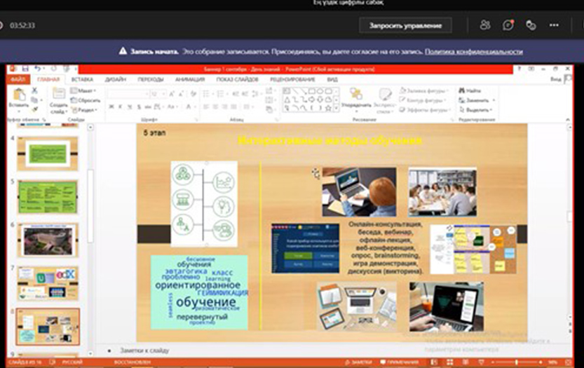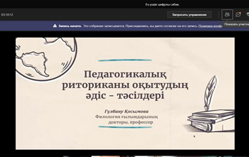 In order to consolidate the practical skills in the group work, team presentations were developed on the topic «My best digital training session on the MS Teams platform»: «Alemdik ruhaniyattagy Abay men Shakespeare», «Historical formation of the Russian language vocabulary», «Physica pannin online okitudin zhana modeli», «Analysis of cations in biological objects», «My best digital learning experience on the platform - an essay», «Digital resources», «Pedagogical rhetoric in the classroom», «The complex», «September 1 - the Day of Knowledge», «Purpose and relevance of the subject of national education», «The book of ideas», «Use of interactive exercises in Russian literature classes», «Soylemnin turlauly muleshleri», «Osimdikterdegi Macro-, microelement», «Organization of pedagogical practice in the conditions of distance learning».