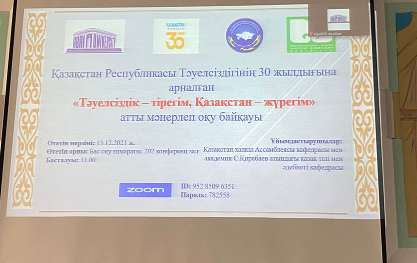 From December 6 to 11, 2021, an interuniversity competition of readers among 1st-year students was held at Abai KazNPU, organized by the Department of the Assembly of the People of Kazakhstan and the Department of Kazakh Language and Literature named after Academician S. Kirabayev on the theme «Tauelsizdik - tiregim, Kazakhstan - zhuregim», dedicated to the 30th anniversary of Independence of the Republic of Kazakhstan.