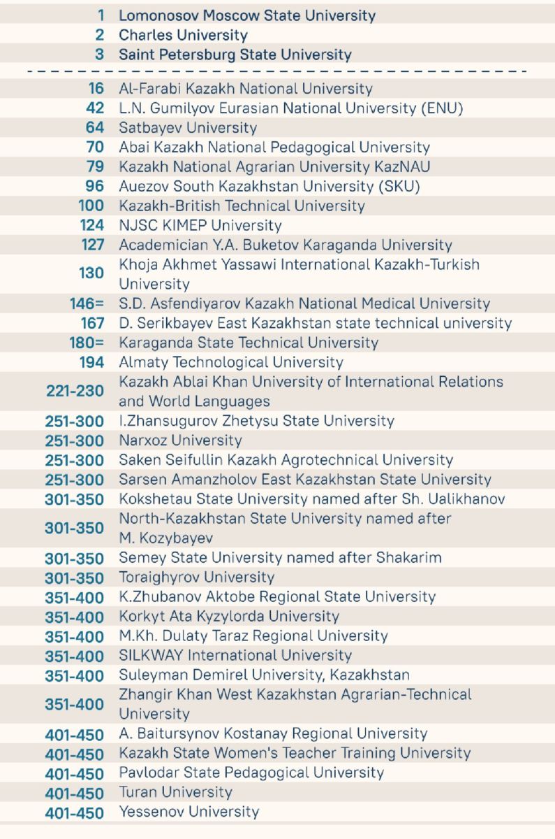 Үздік жоғары оқу орындары рейтингіне Еуропа мен Орталық Азиядағы дамушы елдердің 450 университеті кірді, оның 34-і қазақстандық университет. Рейтингте Абай университеті Қазақстан Республикасының жетекші жоғары оқу орындары арасында 4-ші, педагогикалық ЖОО арасында 1-ші орынды иеленді.