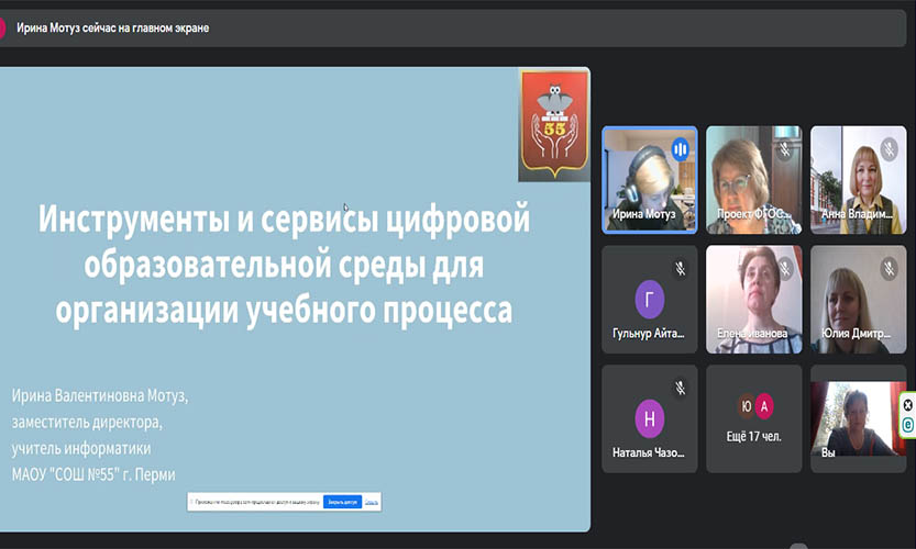 - Motuz Irina Valentinovna, computer science teacher of the «Secondary School No. 55» in Perm, topic: «Tools and services of the digital educational environment for the organization of the educational process»;