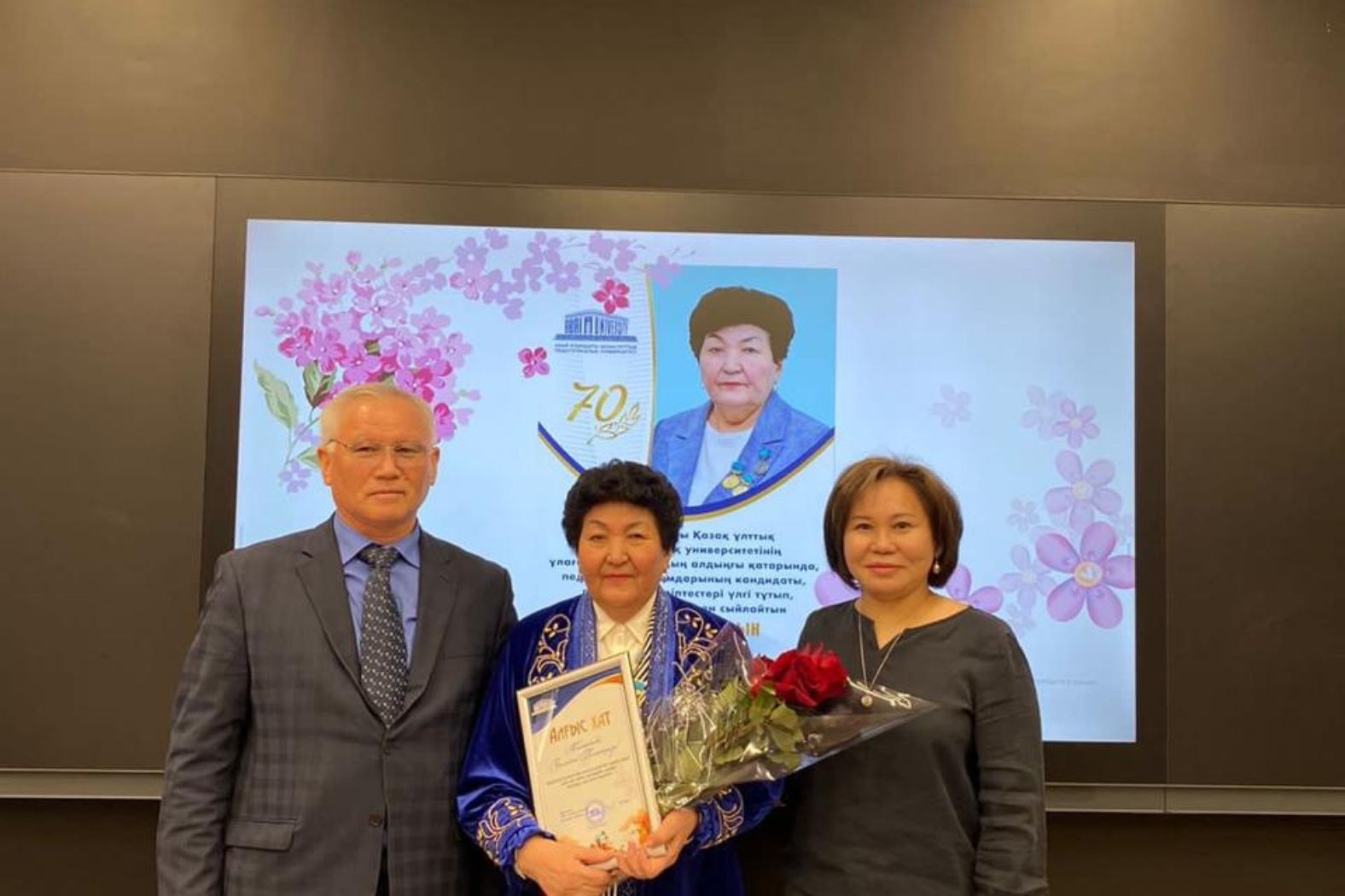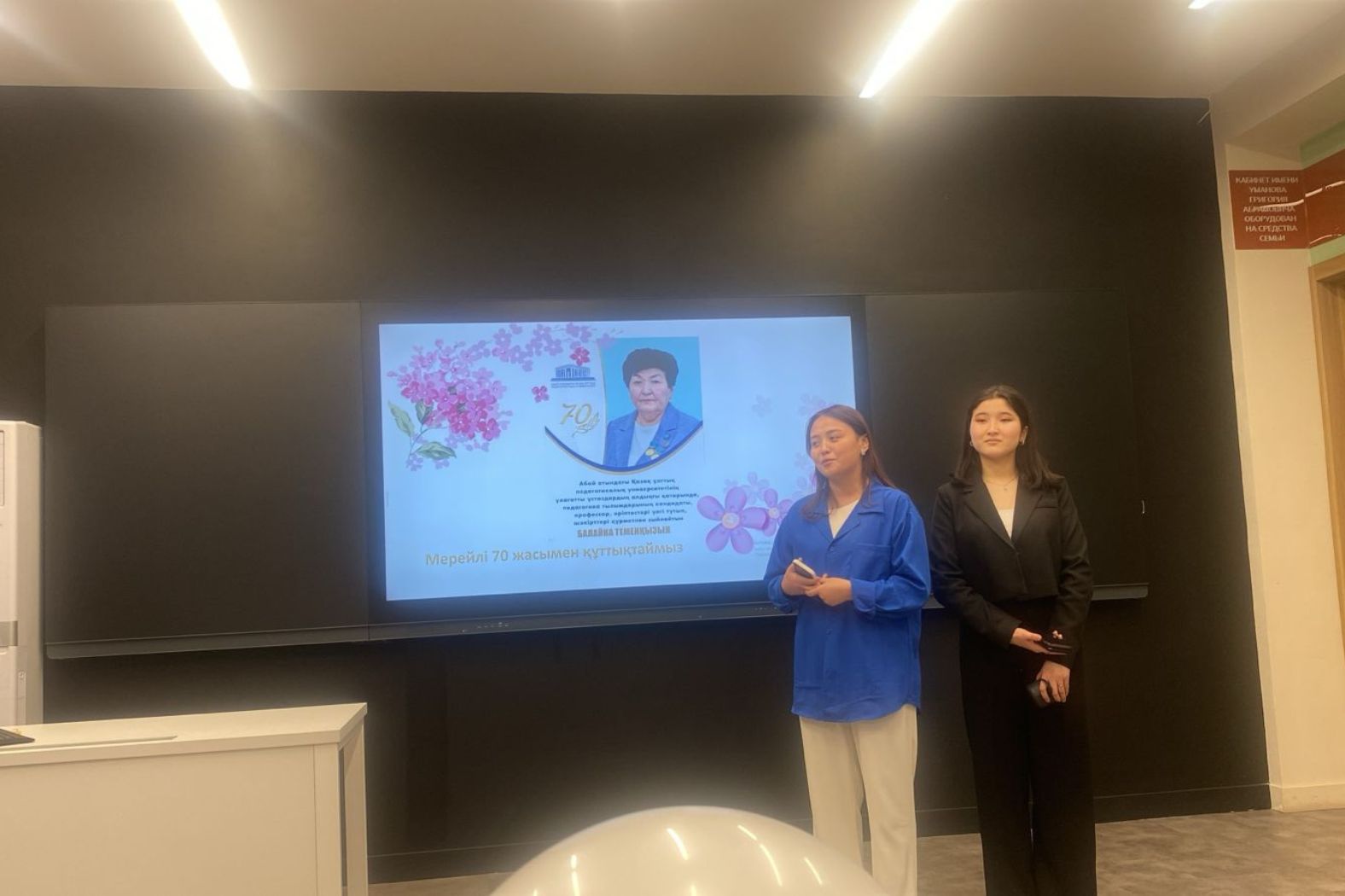 With a letter of gratitude on behalf of the Rector of KazNPU named after Abay, Chairman of the Board Tilep B.A. The director of the Institute of Pedagogy and Psychology, Abaeva G.A., and the chairman of the trade union committee of KazNPU named after Abai, Ibraimov M.B., spoke. expressed gratitude for many years of work and presented a gift from the trade union.