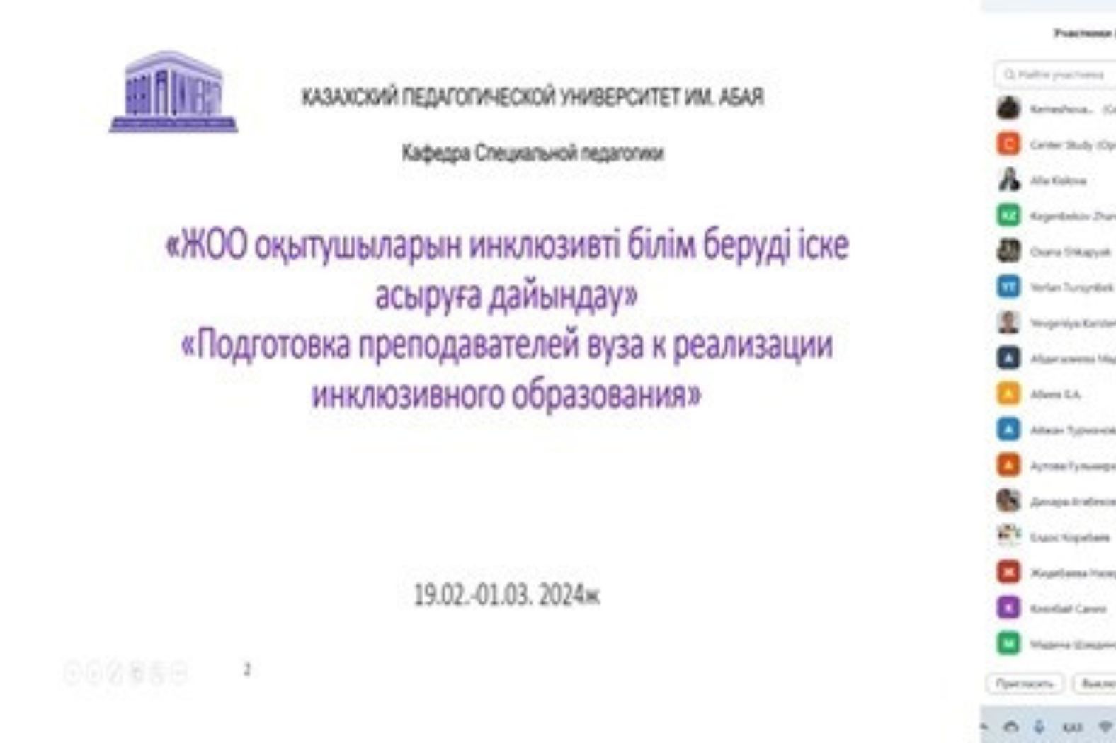 From February 19 to March 1, 2024, at the Institute of Pedagogy and Psychology of KazNPU named after Abay, advanced training courses are being held for teaching staff of higher educational institutions interested in the problem of the course "Training university teachers for the implementation of inclusive education".