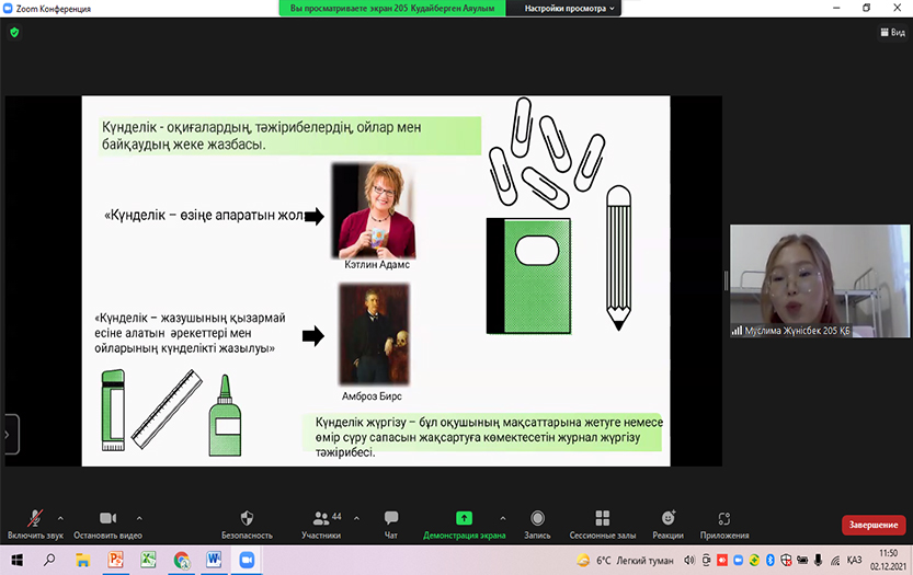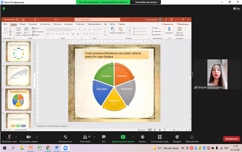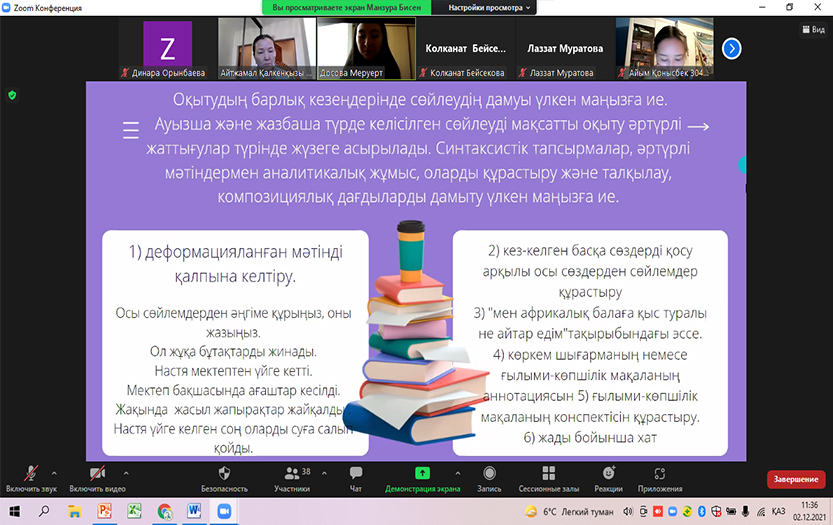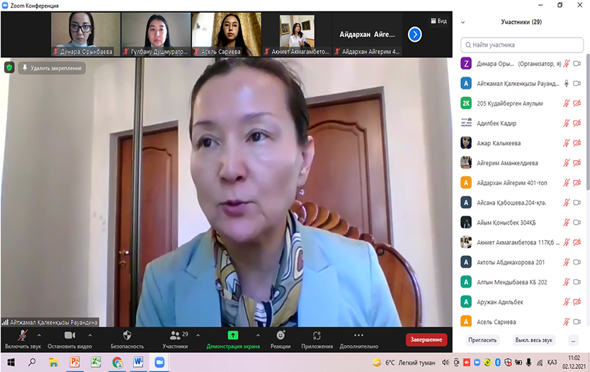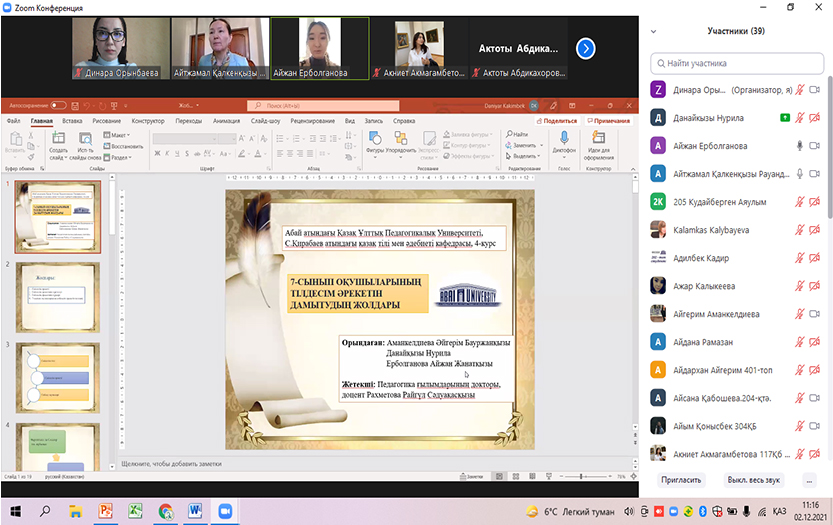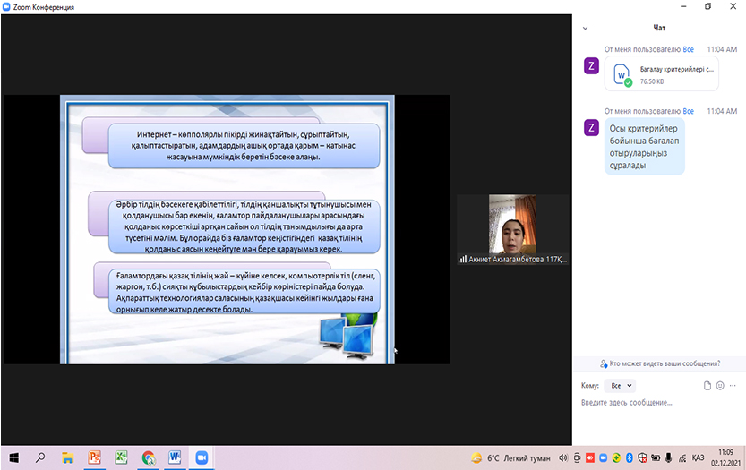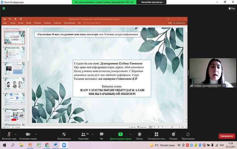 On December 2, 2021, the traditional 76th scientific conference of students and undergraduates took place. In the section «New directions in language theory and methodology» 21 students from Kazakh groups and 5 students from Russian groups of other specialities made scientific presentations. Students of physics, mathematics and law especially enjoyed the presentation on the problems of the Kazakh language. The topics of the reports were relevant and interesting. The authors` speeches are systematic, their thoughts are rational, and their scientific conclusions are realistic.