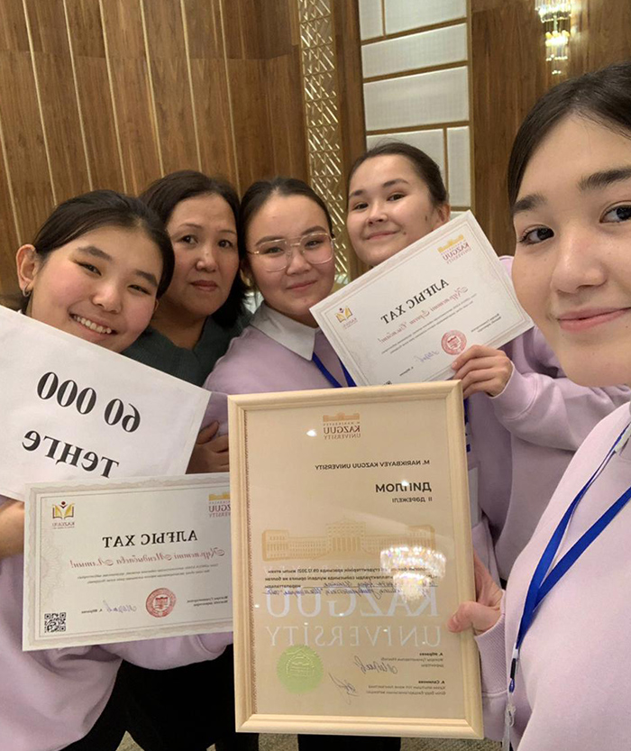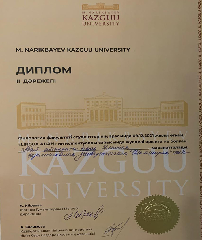 We congratulate students of 2nd course 202 group of the speciality «Russian language and literature» A. Mendybayeva, A. Iosifova and students of 2nd course 202 group of the speciality «Kazakh language and literature» of Abai KazNPU Institute of Philology and multilingual education with award of II degree diploma. Our students participated in the competition as a team «Shamshyrak». We express our gratitude to senior teacher J.A.Kokanova and head of the club «Soztanym», senior teacher R.K.Bakbergenova for scientific guidance.