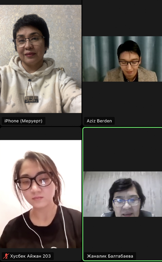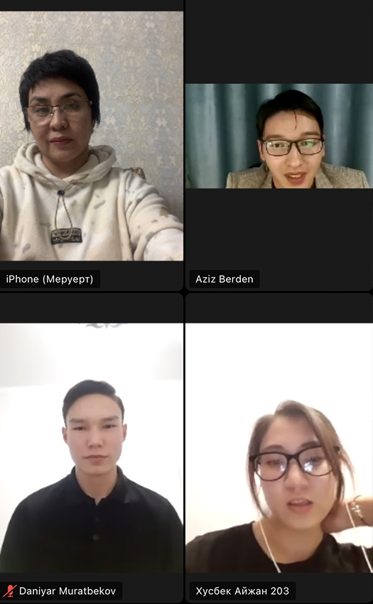 In the first part of the evening, the purpose of the event was explained, and the students of the group Zh. Rakhat, M. Ainazarova, A. Malik, A. Kuanyshkyzy expressively recited the poems of the poet: «Why do I miss you, childhood?», «My profile», «To Maygul» and others.