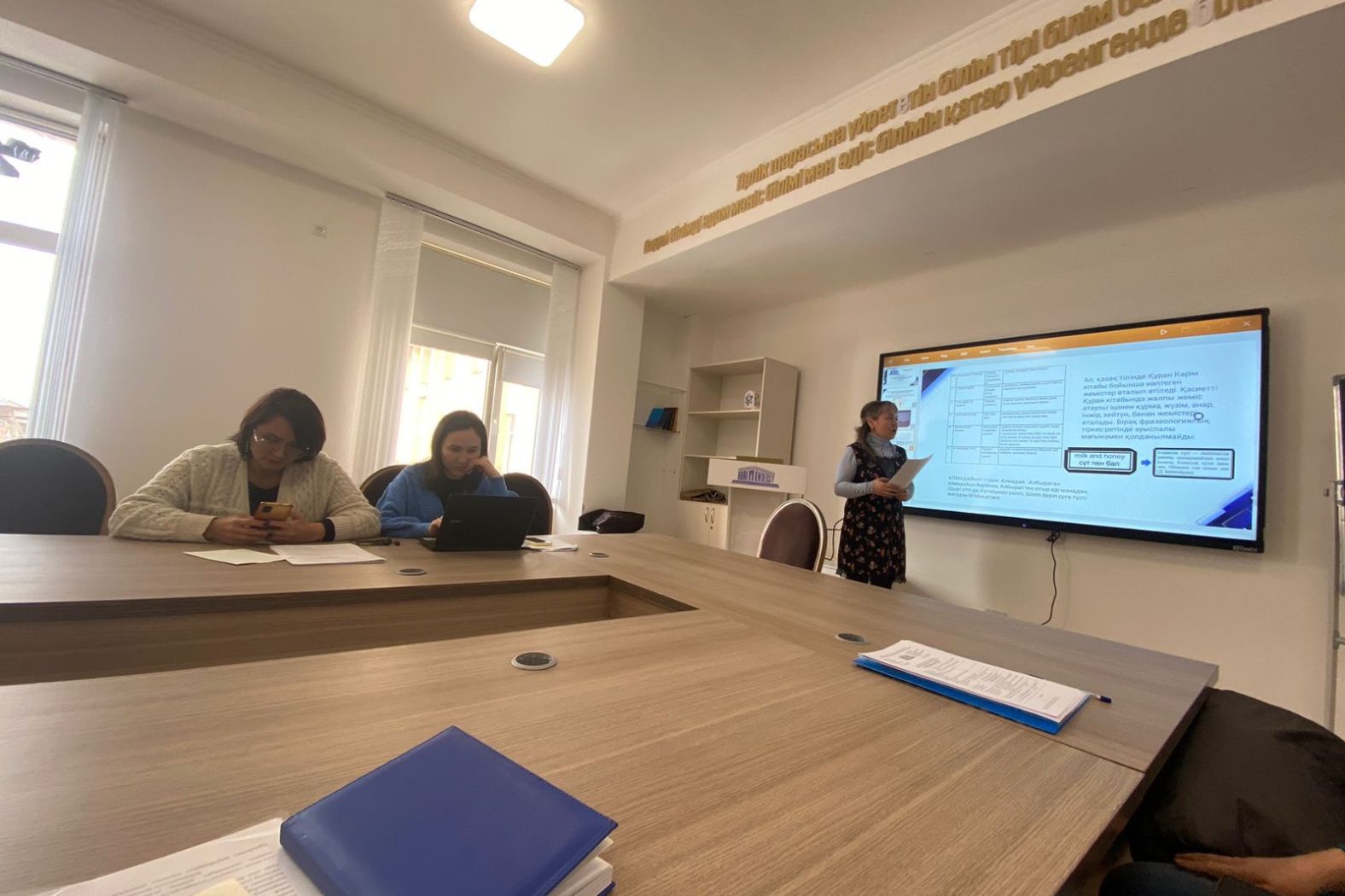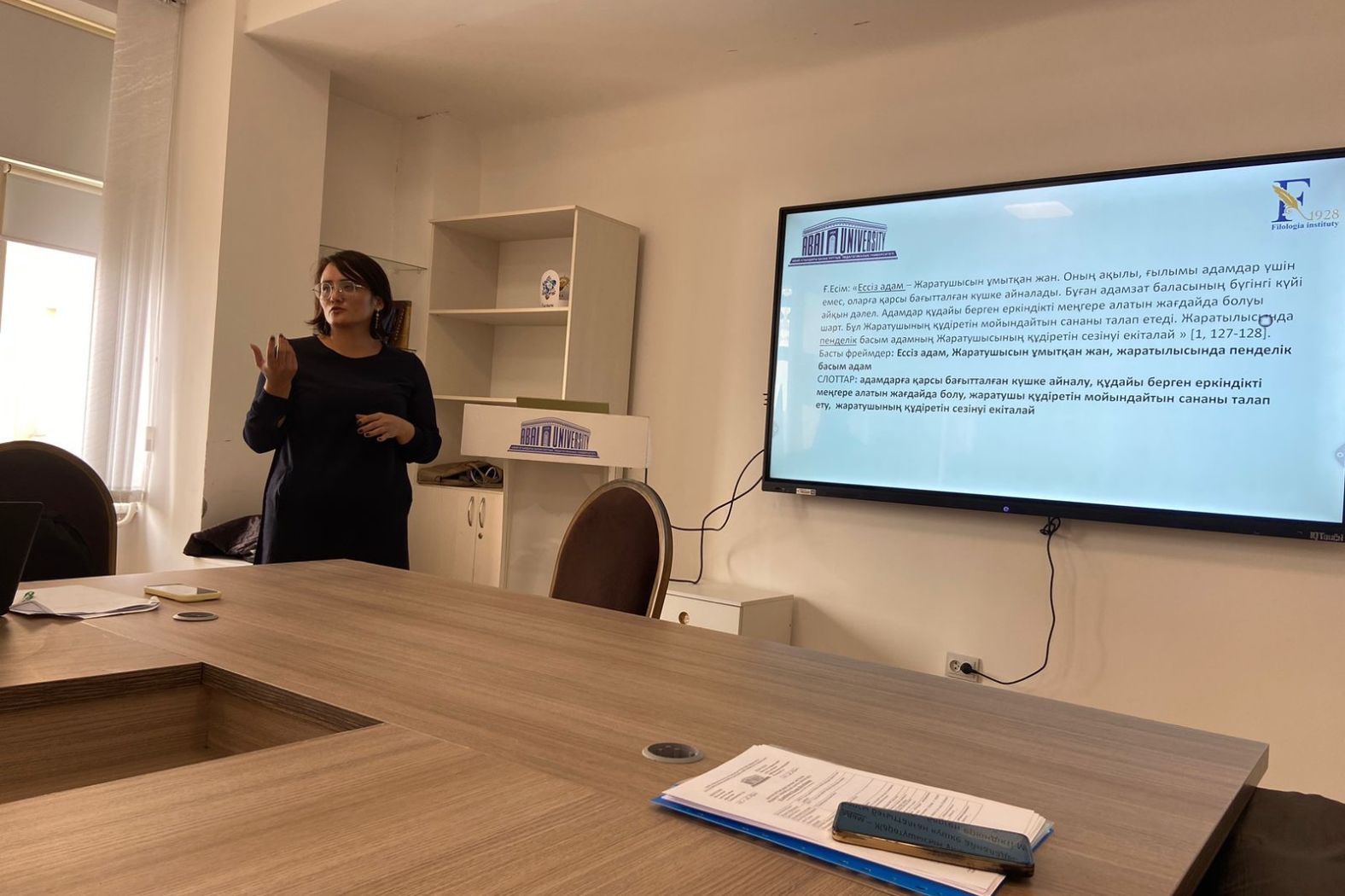 The scientific seminar was attended by the head of the department, doctor of philology. Ilyasova N.A., candidate of pedagogical sciences Moldasanov E., senior teacher Seytaliyeva K., doctor of philology, Prof. Kasymova G., doctor of philology, Prof. Koblanova A., doctor of philology Zhirenov S.