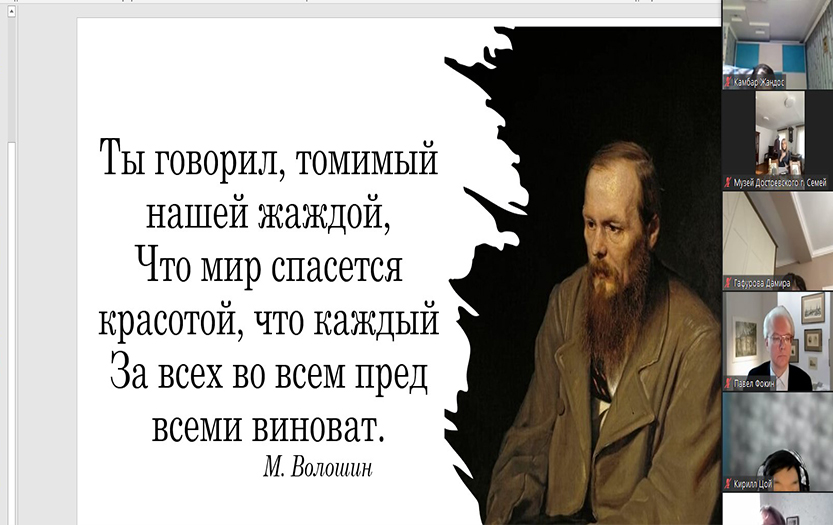 Ресейдің Алматыдағы Бас консулдығының консулы, Россотрудничество өкілі Т.Барышникова Қазақстандағы ТМД елдерінің мәдени мұрасын насихаттау жөніндегі жұмысы туралы баяндап берді. Ф.М. Достоевский туралы қызықты суреттермен егжей - тегжейлі әңгіме тыңдаушыларға В. И. Даль атындағы орыс әдебиеті тарихы мемлекеттік мұражайы бөлімінің меңгерушісі П. Фокин «Мәскеудегі Достоевский үйі» мұражай орталығы (Мәскеу) ұсынды. Семейдегі жазушының өмірі туралы Ф.М.Достоевский (Семей қ.) әдеби-мемориалдық мұражайының экспозициялық-көрме секторының меңгерушісі В. Соловьева әңгімелеп берді.