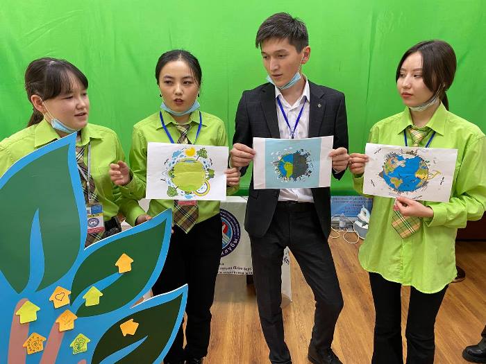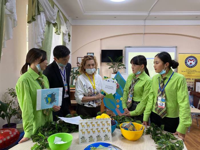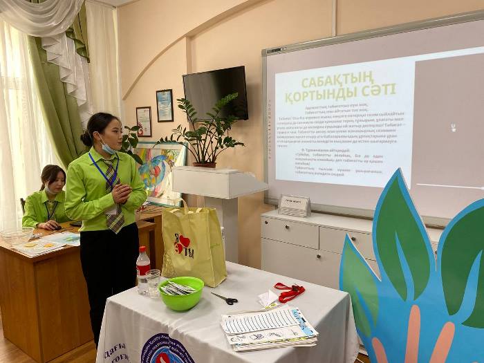The state of the ecology of the planet in the theoretical and practical parts of the event was considered on the basis of the topics of the curriculum «Ecological Clubs»: 1) Water resources. 2) Waste recycling. 3) Biodiversity, 4) Eco trail. The theoretical part included tasks according to the program: teaching biodiversity; teaching methods of protecting natural resources; developing a sense of respect for nature. The practical part of the hour was organized in a specially created green circle «Question-answer». Students-volunteers paid special attention to the exchange of experience, games, methods of interactive lessons established in the program of the project «Environmental Clubs».