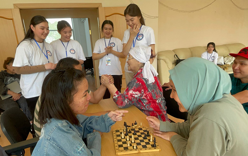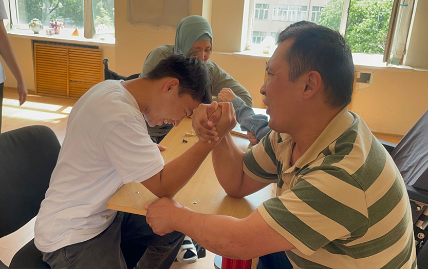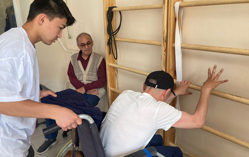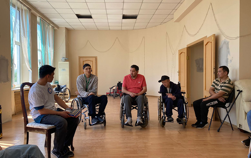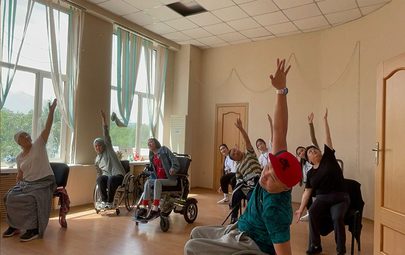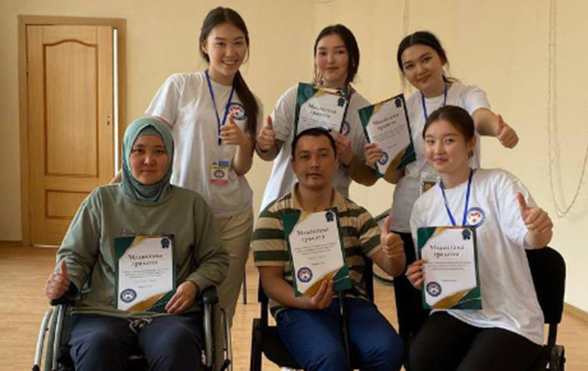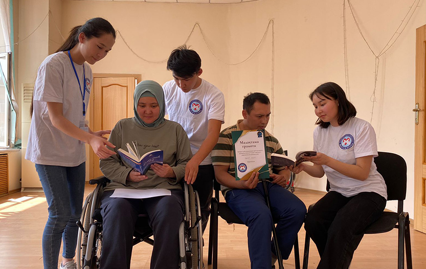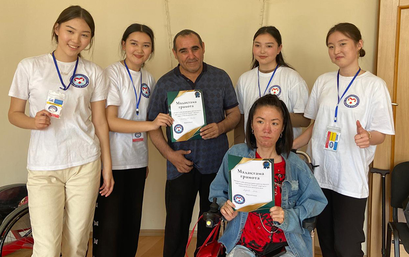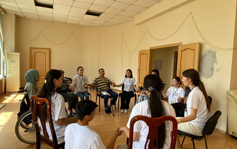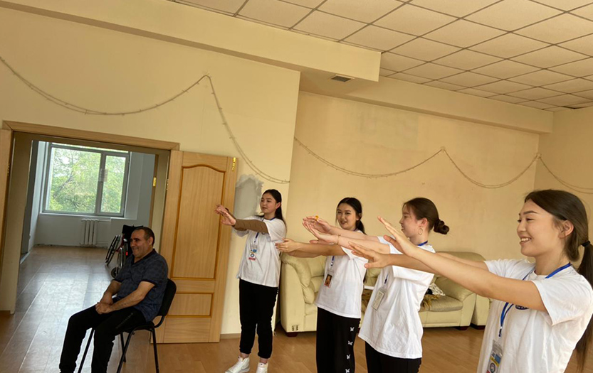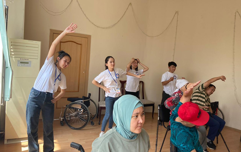 On May 20, 2022 on social-pedagogical, moral-spiritual, cultural-educational directions of «Meirim» club under the direction of Shirinbayeva G.K. students - volunteers of the 1st course of the specialty «6В01801-Social pedagogy and self-knowledge» T. Kerimbai, B.Serikbai, A.Duisenbai, A.Razakbai, A.Nursapina, Sh. Omirzakyzy and A.Asheken held sport and health workshop «Sport is a source of soul energy» for the people with disabilities in social-rehabilitation centre «ERZI» in Almaty.