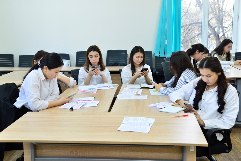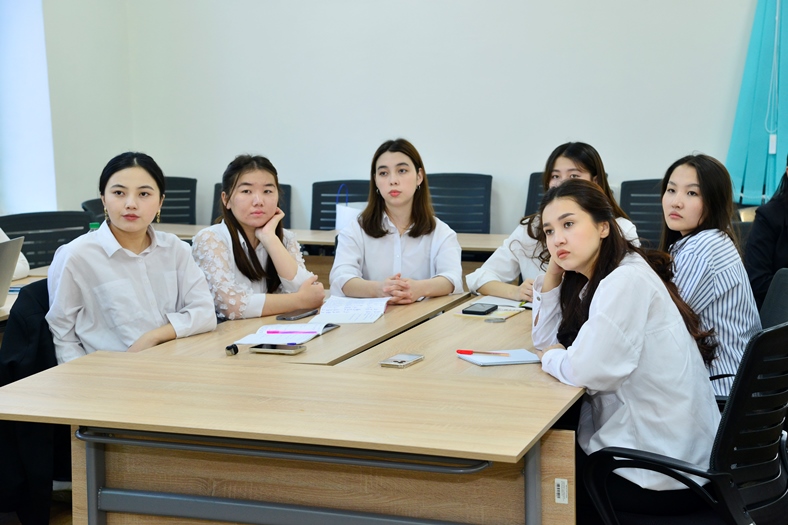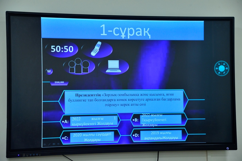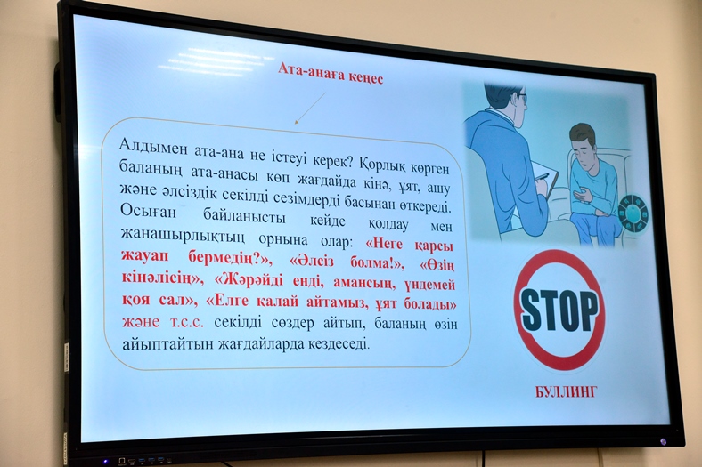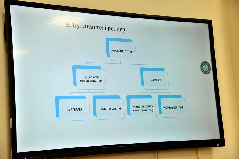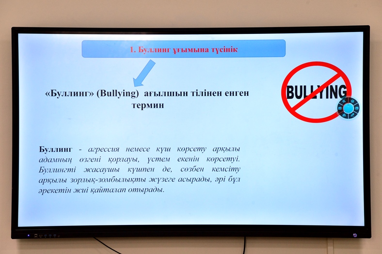 A.A. Alimbekova explained the history of bullying (cyberbullying), methodological foundations, types, factors and technology of its prevention. Students asked questions and received answers with the help of animated slides. The students were sent a test-questionnaire "Bullying", compiled in Google Forms by the author of the anti-bullying programme, Professor of the University of Bergen (Norway), psychologist D. Olweus. The students` answers were reflected on a Led screen and the results were analysed jointly by the lesson participants.