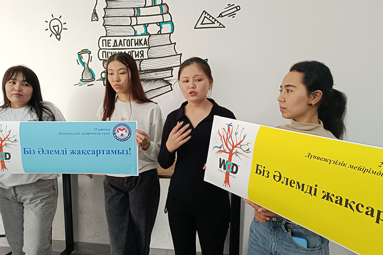 On this basis, on November 28, 2023, under the leadership of Associate Professor Shirinbayeva Gulbakhira, volunteer students in the specialty «6B01801-Social Pedagogy and self-knowledge» organized an information campaign under the slogan «We are making the world a better place!» dedicated to the World Day of Compassion and Mercy on the moral, spiritual, advertising and propaganda directions of the Meirim club.