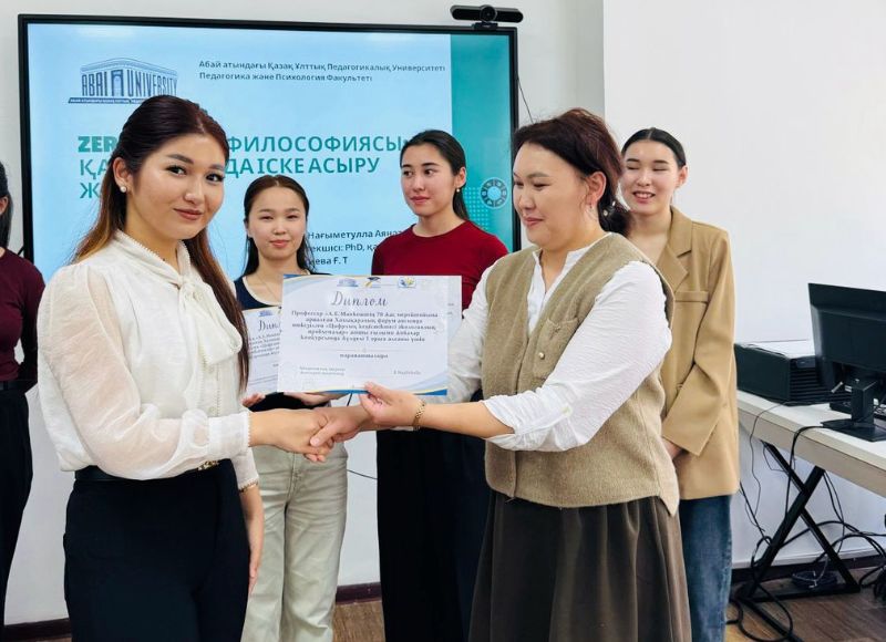 At the conclusion of the competition, the Vice Dean for Research and International Cooperation of the Faculty of Pedagogy and Psychology, A.Zh. Zhakupova, and the Head of the Department of Preschool Education and Social Pedagogy, U.K. Qiyakbayeva, delivered closing remarks. They expressed their gratitude to the young researchers and their scientific advisors for their active participation. The winners were awarded special diplomas, and all participants received certificates.