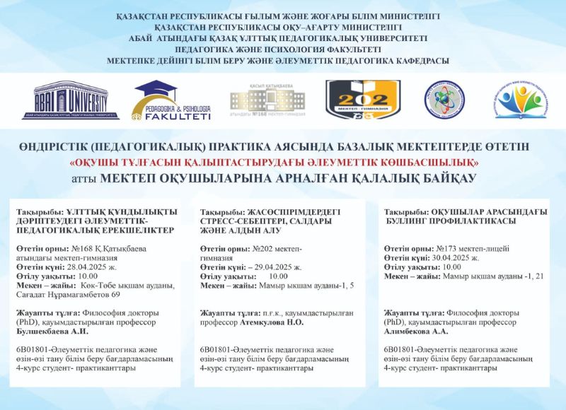The First Stage of the Citywide Student Competition "Socio-Pedagogical Features of Promoting National Values" On April 28, 2025, Abai Kazakh National Pedagogical University, Faculty of Pedagogy and Psychology, Department of Preschool Education and Social Pedagogy, organized the first stage of the citywide student competition "Social Leadership in Shaping the Personality of a Student." The event took place at School-Gymnasium No. 168 named after K. Katykbayeva in Almaty on the topic "Socio-Pedagogical Features of Promoting National Values."