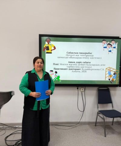 On February 4, 2026, within the framework of pedagogical practice, the Department of Preschool Education and Social Pedagogy of the Faculty of Pedagogy and Psychology at Abai Kazakh National Pedagogical University held an open lecture for 3rd-year students of the educational program 6B01201 – Preschool Education and Upbringing. The open lecture on the topic “Methodology of Conducting Outdoor Games for Different Age Groups” was delivered in the course “Methodology of Physical Education of Preschool Children” by the 2nd-year doctoral student of the educational program 8D01201 – Preschool Education and Upbringing, Sulushash Kaskyrbayevna Kudaibergenova (scientific supervisor: Candidate of Pedagogical Sciences, Associate Professor N.O.Atemkulova). The course instructor was Master’s degree holder, Senior Lecturer A.A.Auezova. The main purpose of the lecture was to form students’ theoretical knowledge about the methodology of organizing and conducting outdoor games in accordance with the age characteristics of preschool children. During the lecture, doctoral student S. Kudaibergenova actively used interactive teaching methods and various game-based technologies. The applied methods contributed to the development of students’ critical thinking and enabled them to express their opinions clearly and with justification. A total of 60 students attended the lecture. The presented material was clear, structured, engaging, and accessible. Students demonstrated a high level of activity and interest, striving to give accurate and complete answers to the lecturer’s questions, which indicated that they had successfully mastered the new material. Sulushash Kudaibergenova established effective interaction with the audience. At the end of the open lecture, students achieved the following learning outcomes: they were able to distinguish types of outdoor games according to the age characteristics of preschool children, understood the main methodological requirements for organizing outdoor games, and mastered the pedagogical principles of selecting appropriate games for each age group. In addition, students identified effective ways to apply outdoor games in their future professional activities. Feedback was collected at the end of the lecture, during which students shared their impressions and suggestions. The objectives of the lesson were fully achieved. Students mastered the topic and acquired theoretical knowledge applicable to their professional practice. The open lecture was informative, methodologically sound, and effective. The following faculty members attended the open lecture: Head of the Department, Candidate of Pedagogical Sciences, Associate Professor Ulbosyn Kozybayevna Kyyakbayeva; Doctor of Pedagogical Sciences, Professor Kadisha Kadyrovna Shalgynbayeva; Candidate of Pedagogical Sciences, Associate Professor Nazira Omarovna Atemkulova; PhD, Acting Associate Professor Galiya Turysbekovna Abilbakiyeva; Master’s degree holder, Senior Lecturer Auezova Aizhan Abildayevna; Master’s degree holder, Senior Lecturer Zhanna Zhetkerbaykyzy Asankhanova; and doctoral student Farida Omarbekova. The participants discussed the lecture and shared their professional opinions.
