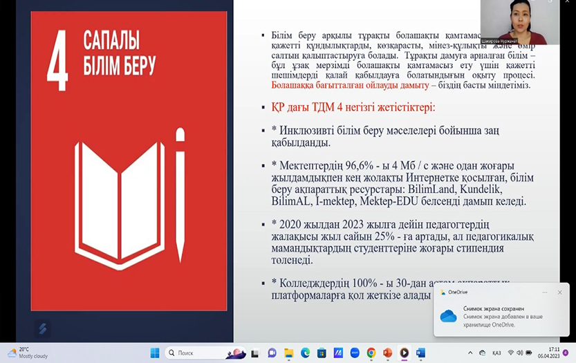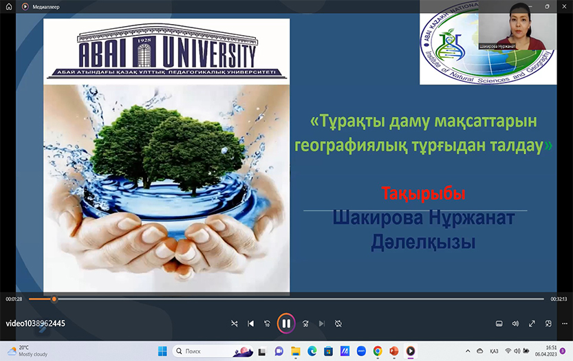 The Decade of Science 2023, dedicated to the 95th anniversary of Abai KazNPU, is very active. Every member of staff is keen to contribute to the set of activities. So, on April 6, 2023 post doctoral student of the Institute of Natural Sciences and Geography, N.Shakirova held a webinar "Geographic analysis of the Sustainable Development Goals" for young researchers, doctoral students, undergraduates and students. The topic was discussed within the framework of one of the tasks set by the research project "Implementing the Sustainable Development Goals in Geography Teacher Training and Retraining", implemented by the order of the Ministry of Science and Higher Education of the Republic of Kazakhstan. The webinar aimed at public outreach on the Sustainable Development Goals. The speaker touched upon questions: when and on the basis of what documents the SDGs appeared, what their differences from the Millennium Development Goals are, the tasks which Kazakhstan undertook to implement the SDGs, problematic issues and national specificities of each goal achieved in the country were pointed out. It was stressed that the goals and objectives were achieved at their level.
