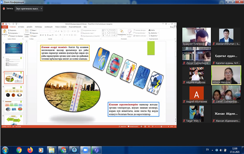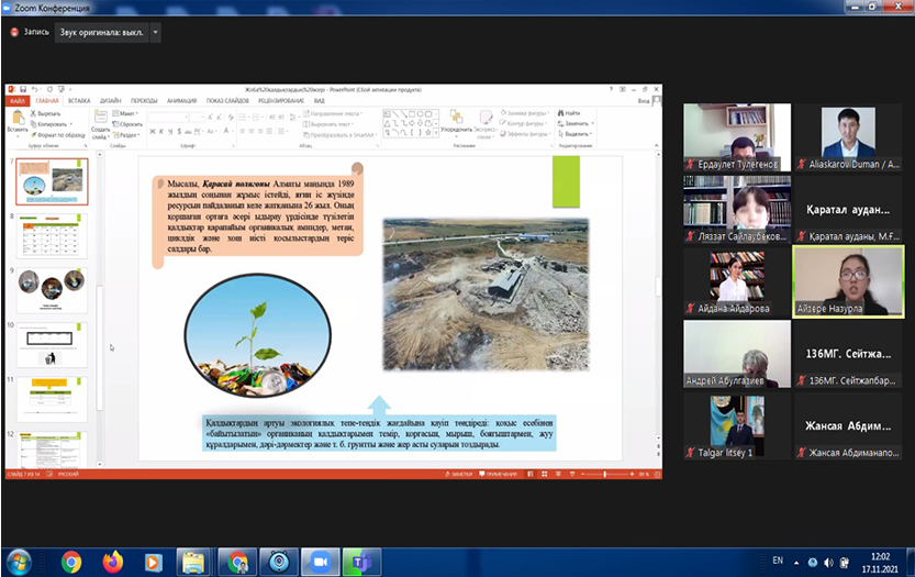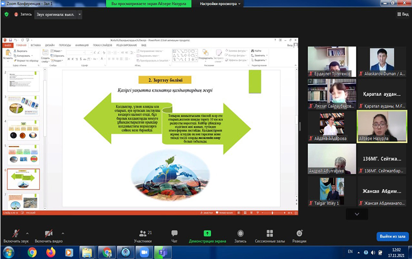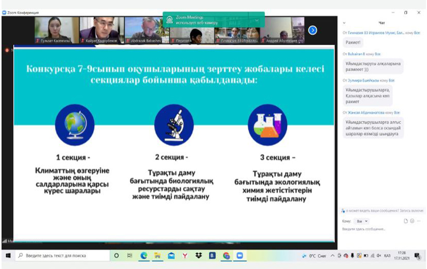 On November 17, 2021, the Institute of Natural Science and Geography of Abai KazNPU organized city competitions for research projects of pupils in grades 7-9 on the topic «Young Researcher and Sustainable Development» on the ZOOM platform. Director of the Department of Science Abdigaparova Ulzharkyn and Director of the Institute of Natural Science and Geography Kaimuldinova Kulyash held the opening of the solemn part of the events, wishing good luck to the participants of the competition.