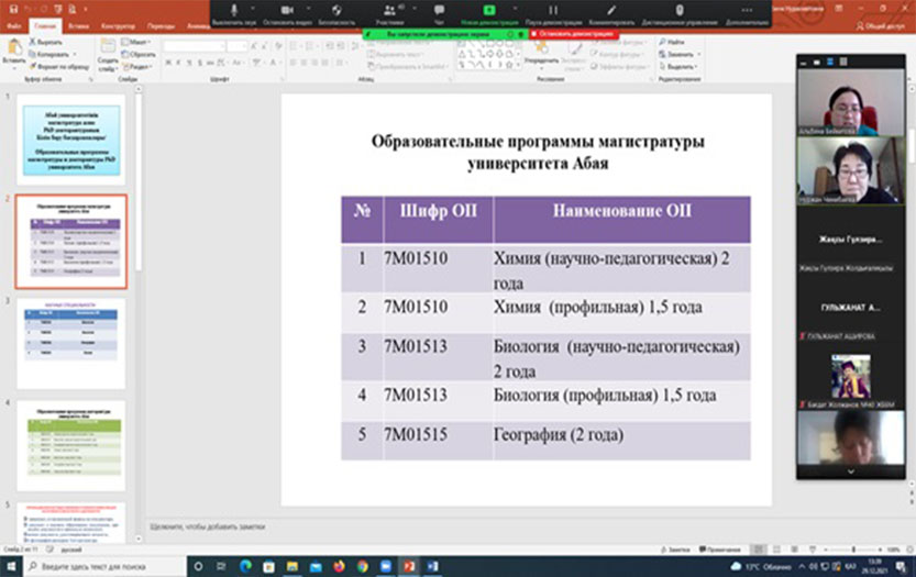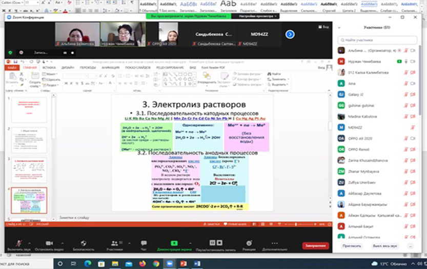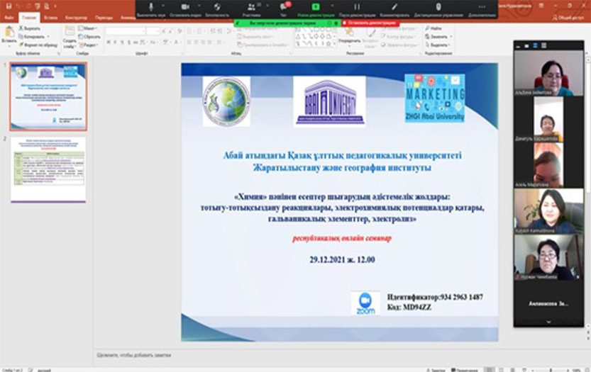 On December 29, 2021, the marketing department of the «Institute of Natural Sciences and Geography» of Abai KazNPU held a republican online seminar «Methodological techniques for solving problems in the discipline «Chemistry»: redox reactions, a number of electrochemical potentials, galvanic cells, electrolysis». The event was attended by about 70 chemistry teachers of secondary schools, gymnasiums, lyceums from many regions of the country: Atyrau, Almaty, Turkestan, Kostanay, Aktobe, East Kazakhstan, Kyzylorda, North Kazakhstan, Pavlodar regions, cities of Almaty, Arkalyk and others.
