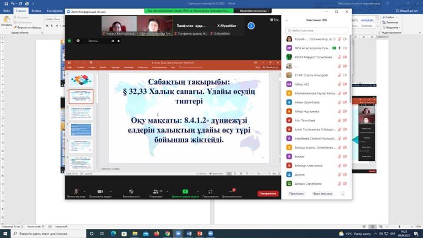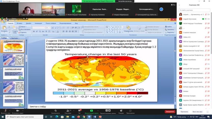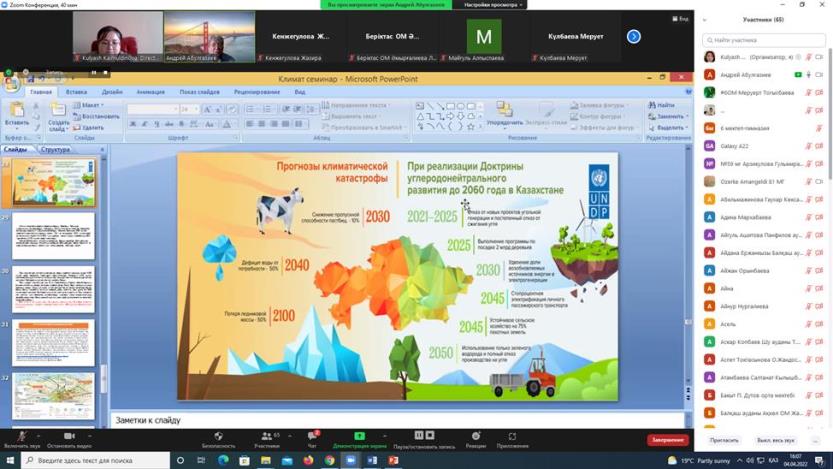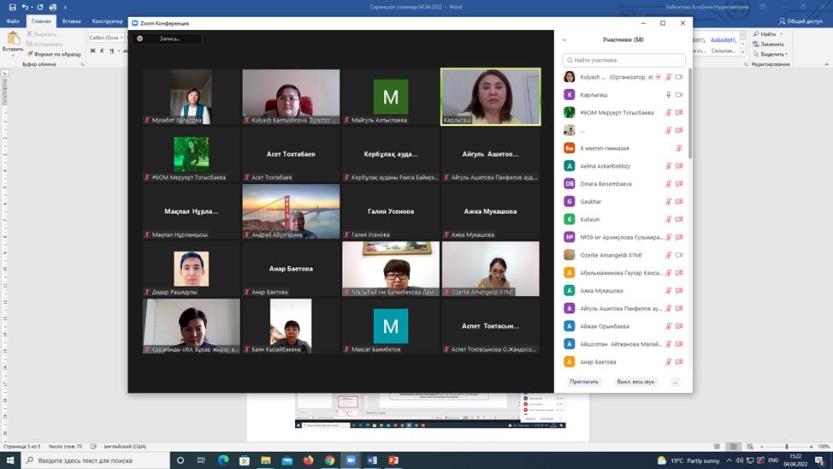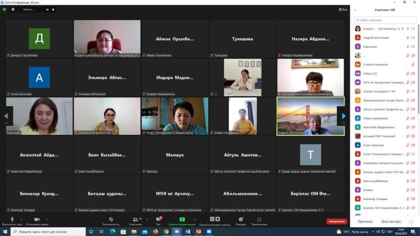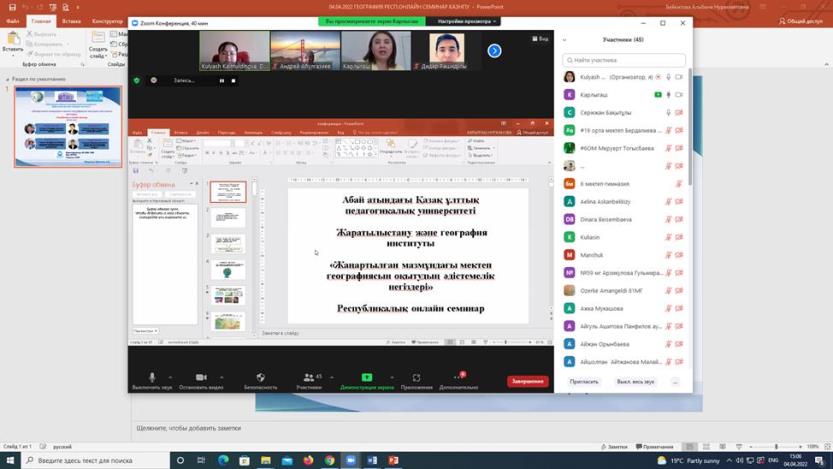 On April 04, 2022, the Abai KazNPU Institute of Natural Sciences and Geography held a republican online seminar «Methodological foundations of teaching school geography of updated content». The event was attended by about 70 geography teachers of secondary schools, gymnasiums, lyceums of Atyrau, Almaty, East Kazakhstan, Karaganda, Zhambyl regions, Almaty, Nur-Sultan, etc.