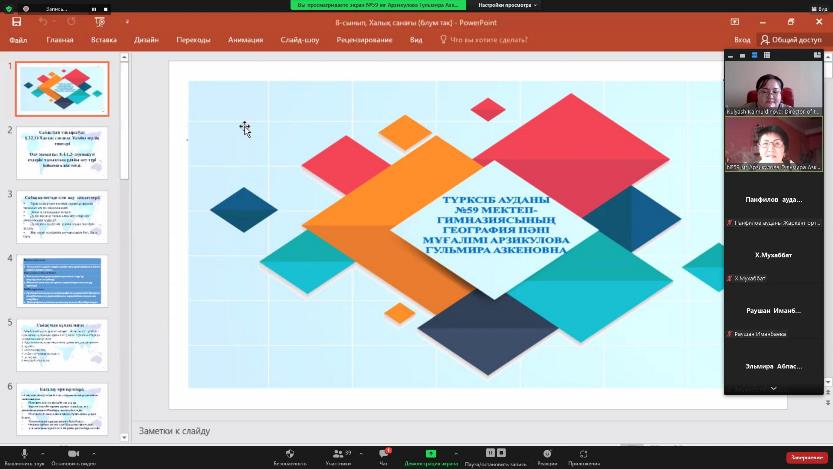 Geography teacher, teacher-researcher of the gymnasium of school No. 59 of the Turksib district of Almaty Arzikulova Gulmira, held a master class on the topic «8th grade. Population census, types of question production (using Bloom`s taxonomy levels)». She explained the ways of applying Bloom`s taxonomy levels in geography lessons.