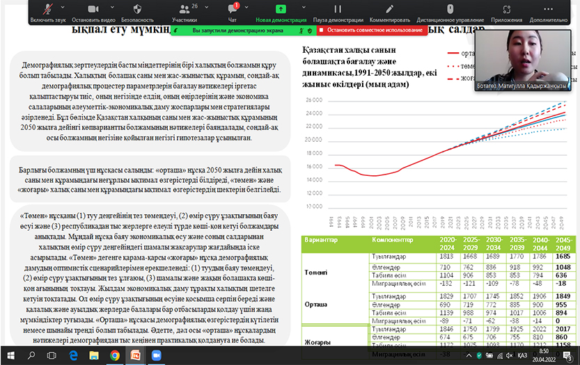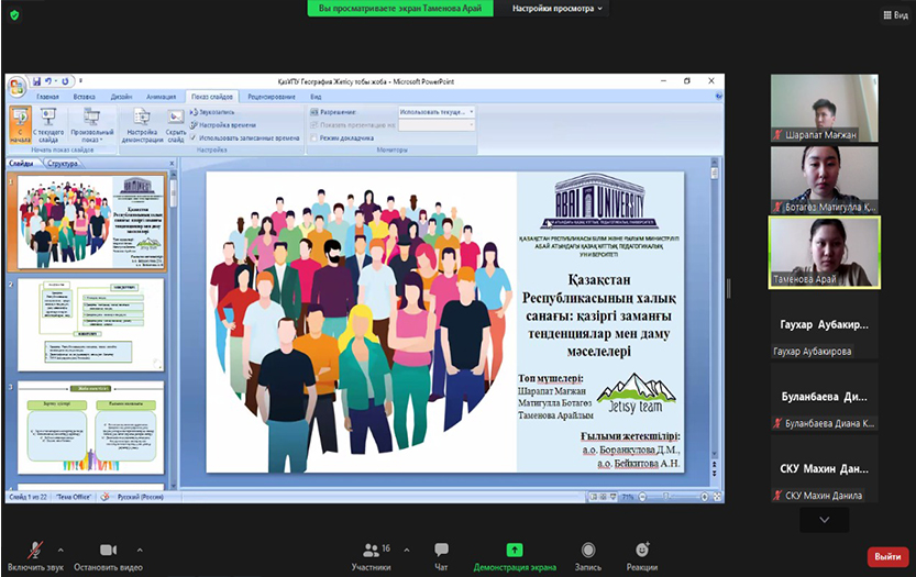 The Olympiad was held in three rounds: team presentation; online test; project defence. Team Zhetysu defended the research project on «Population Census in Kazakhstan: current trends and problems of development».