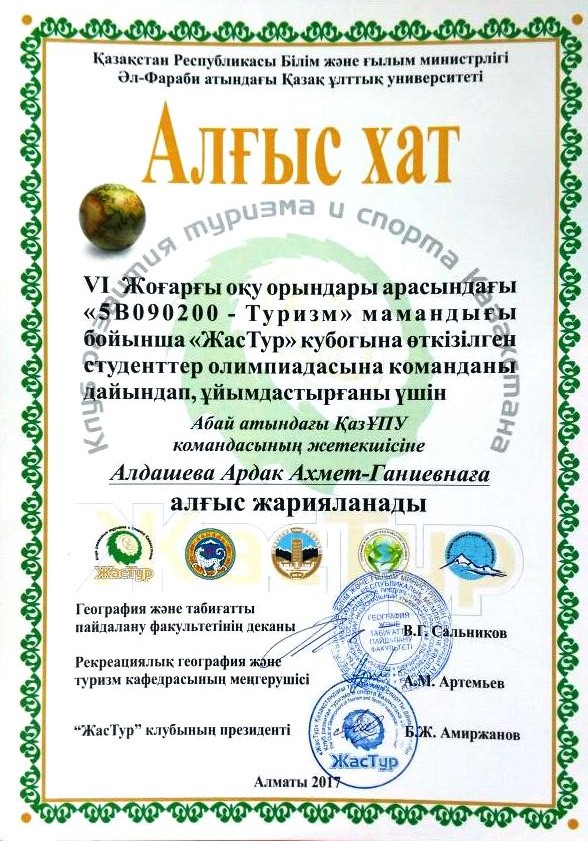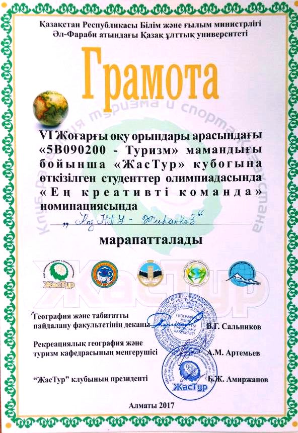 On 14 April , 2017 VI INTERREGIONAL INTERUNIVERSITY OLYMPIAD OF STUDENTS ON SPECIALTY "5В090200 - TOURISM" was held on the basis of Al-Farabi KazNU.