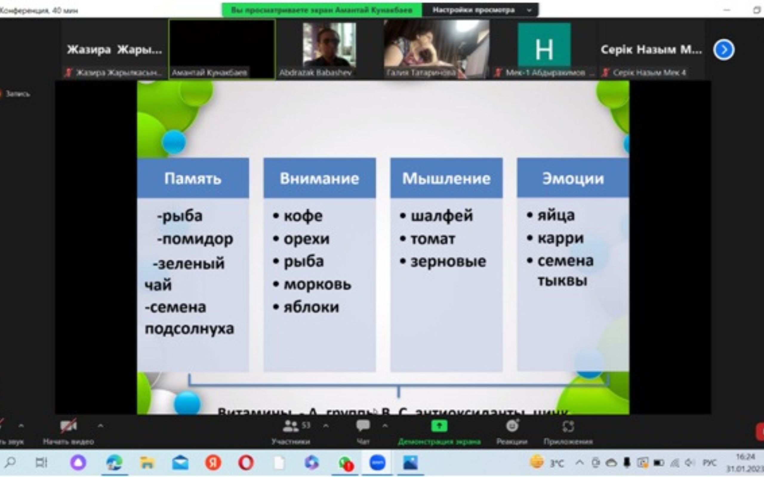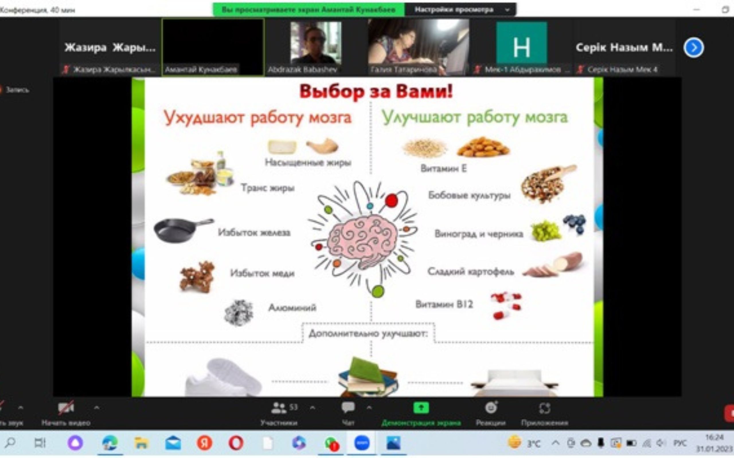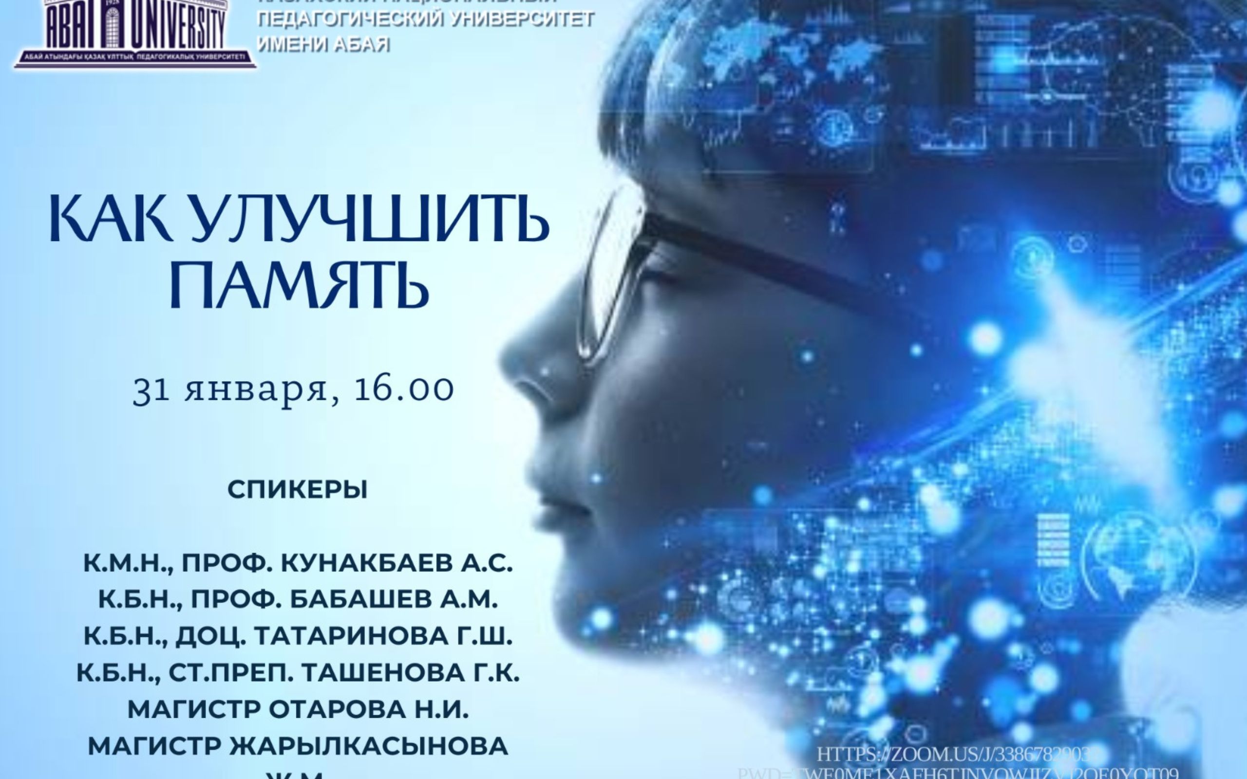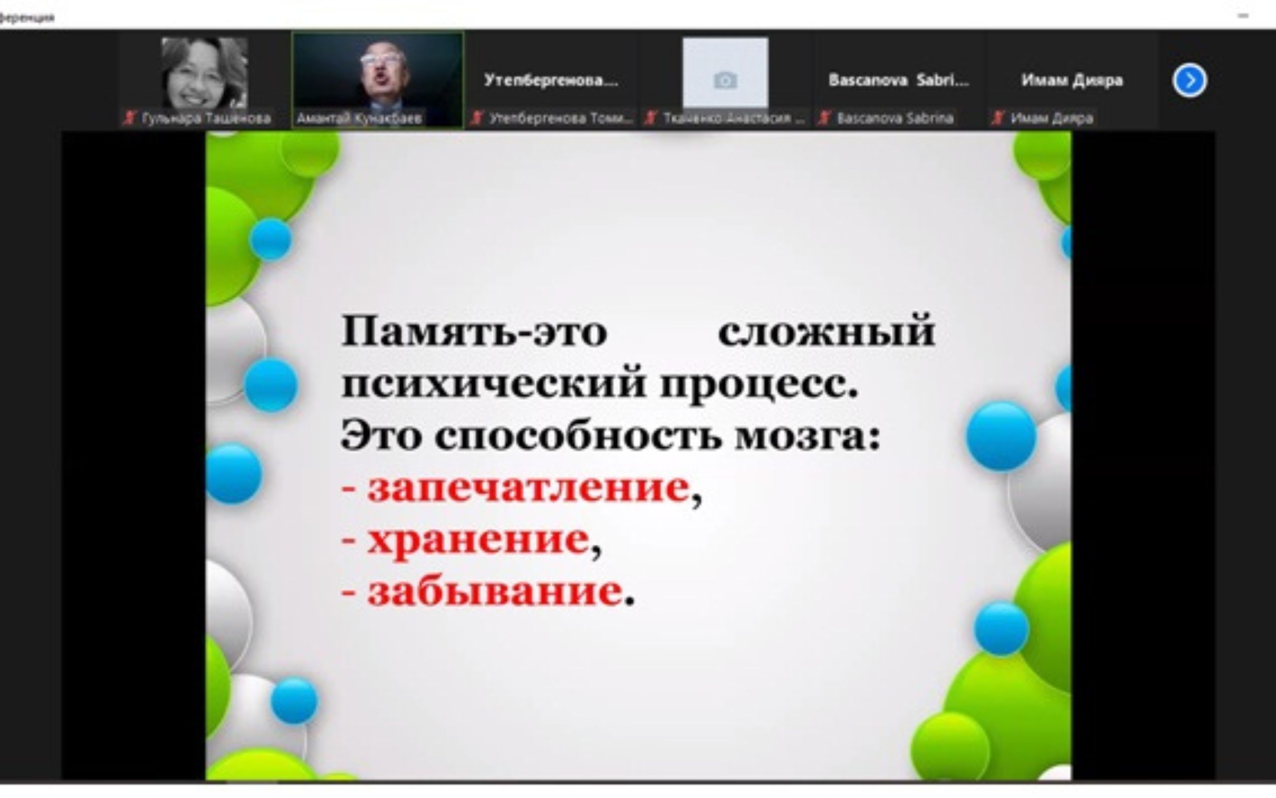 Conference «How to improve memory» On January 31, 2023, professors of the Department of Biology Kunakbaev A.S., Babashev A.M., associate professor Tatarinova G.Sh., senior teachers Tashenova G.K., Otarova N.I. and teacher Zharylkassynova Zh.M. held a сonference on the topic "How to improve memory " was held at the university level in order to form a healthy lifestyle among students in an online format. The event was attended by 1st year students of Institute of Natural Sciences and Geography, Institute of Philology and Multilingual Education, Institute of Mathematics, Physics and Computer Science, Institute of Arts, Culture and Sports, Institute of Pedagogy and Psychologyand. The organizers showed a video on this topic, told about effective ways that will help strengthen memory and improve brain function.