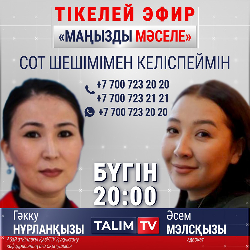 On September 28, 2021, Gakku Rakhimova, a senior lecturer at the Department of Jurisprudence of the Institute of History and Law, took part in a live broadcast on the topic «I disagree with the court decision» in the programme «Important Question» at the invitation of the «Talim TV» channel. The expert gave specific recommendations to improve the legal literacy of the population, TV viewers received answers to their unresolved questions by contacting the studio by phone.