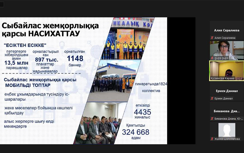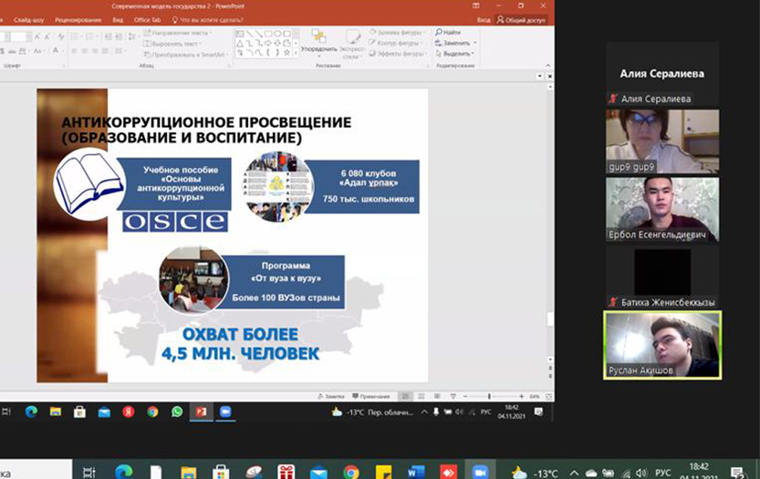 The event was attended by law, psychology, basic law and economics, elementary education and ICT and applied computer science students and master students from the Atyrau State University named after H. Dosmukhamedov, North Kazakhstan University named after M. Kozybayev, Almaty Management University (Almau), Almaty branch of St. Petersburg Humanitarian University of Trade Unions, Abai KazNPU, Turan University, Almaty Academy of Ministry of Interior of the Republic of Kazakhstan named after M. Yesbulatov and Kazakh National Agrarian Research University. The problems of prevention of corruption offences in Kazakhstan and worldwide, the formation of anti-corruption culture as a factor for the development of the rule of law, and psychological aspects of corruption were discussed. Special attention was paid to the question of why brain drain occurs abroad, and whether it is related to corruption.