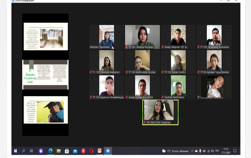 On the occasion of the International Day of Students, Advisor of the Department of World History of the Institute of History and Law A. Sbanbayeva organized an online meeting (in a zoom platform) with 1st year students of the 103rd group of the educational program «6В01606-History-Geography».