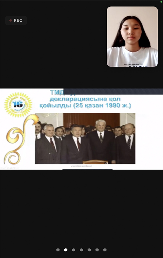 On December 4, 2021, lecturer of the Department of Jurisprudence of the Institute of History and Law, Rakhimova Gakku held an open curatorial hour online with first-year students of the same specialty dedicated to the Day of the First President of RK «Eli suigen, elin suigen-Elbasy». The purpose is to familiarize students with the life and political activities of the First President N.A. Nazarbayev on the eve of the 30th anniversary of independence of our country.