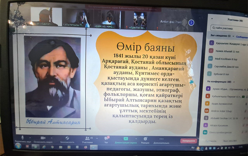 On December 10, 2021, in honor of the 180th anniversary of the famous Kazakh teacher and educator Ibrai Altynsarin, within the framework of the Great Names of the Great Steppe project and in order to implement the Spiritual Revival program, a seminar «The First Teacher of the Steppe» was held. The event was organized by the senior lecturer of the Department of History of Kazakhstan named after academician T.S. Sadykov of the Institute of History and Law, Abdykalykov A.U.