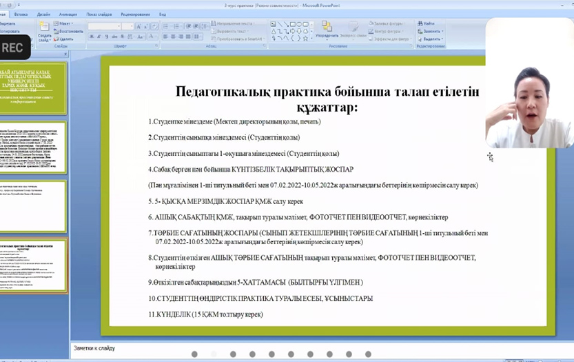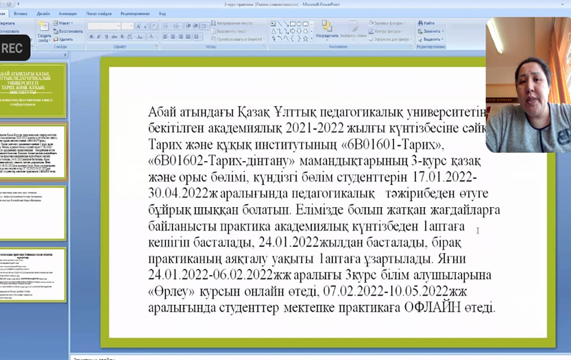 On January 24, 2022, the Department of World History of the Institute of History and Law organized an introductory conference on pedagogical practice in an online format. The event was attended by Deputy Director for Academic Affairs of the Institute of History and Law Asimova D.B., Professor Saudabayeva G.S., psychologist, senior lecturer Kurmanbek M.B., Head of the Department of World History Rustem K.M., practice methodologists and 3rd-year students of specialties «6B01601-History», «6B01602-History-Religious Studies».