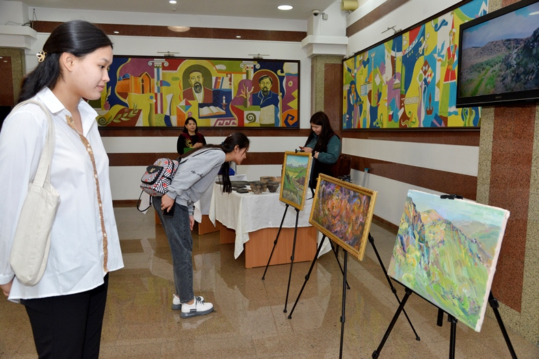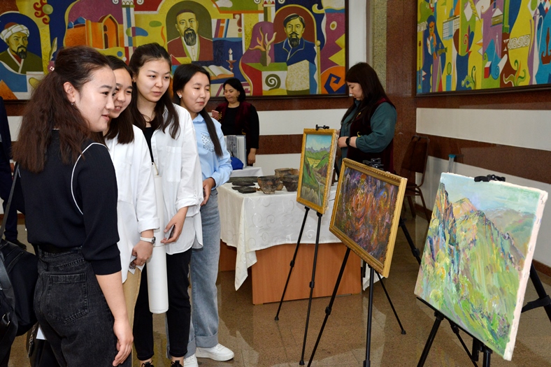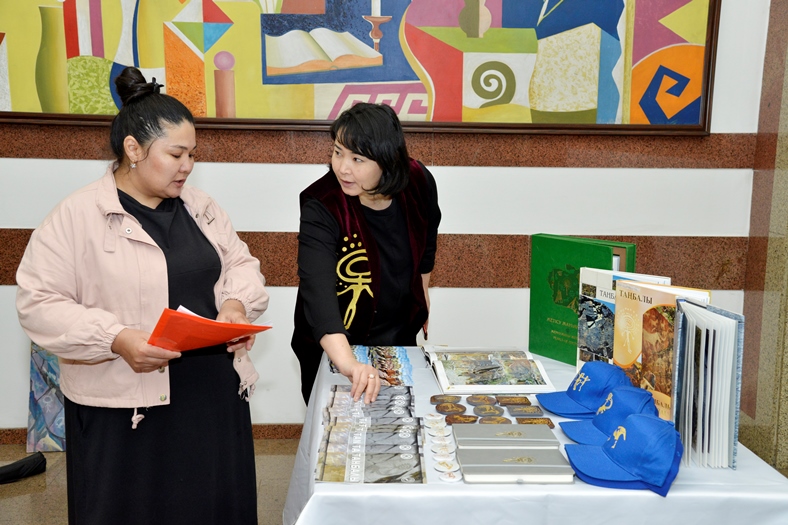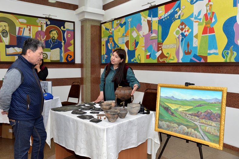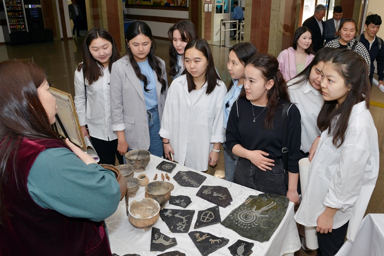 The exhibition was headed by the head of the research department of the museum-reserve «Tanbaly» K.Nurmaksutov, senior researcher K. Kalykbayeva and guide A. Orashova familiarized with the museum exhibits. In particular, within the framework of the traveling exhibition, teachers and students of this educational institution will be able to get acquainted with stone fragments of rock art «Tanbaly» in the open air, ceramic dishes found in archaeological excavations with the participation of employees of the Research Department of the museum in the territory of Zhambyl district of Almaty region, published monographs on rock art «Tanbaly», as well as various information booklets and so on.