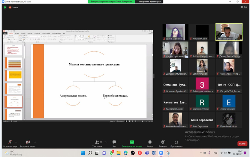 The guest lecture of A.Z.Mukhamedzhanov, Doctor of Law, Professor of the Department of International Law and Human Rights of the Tashkent State Law University on the topic «Constitutional justice: the experience of foreign countries (European, American, Asian models)» aroused intense interest of the audience. Numerous questions of students and undergraduates concerned topical issues of constitutional justice in the paradigm of modern problems of constitutional reforms in Kazakhstan, Uzbekistan and other countries of the world. The guest lecture by U.A.Sherkhanova, a lecturer of this department, on the topic «International and constitutional foundations for the protection of human rights» was saturated with information about legal mechanisms for the protection of human rights and was accompanied by a discussion of the lecturer with students.