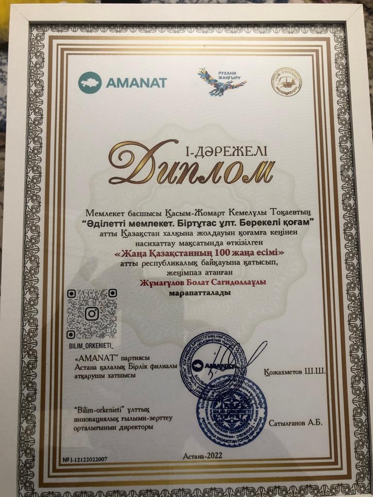In order to promote the Message of the Head of State Kassym-Jomart Tokayev «A FAIR STATE. ONE NATION. PROSPEROUS SOCIETY», Bolat Zhumagulov participated in the national competition «100 new names of the new Kazakhstan» and was awarded a badge for his special contribution to the development of society.