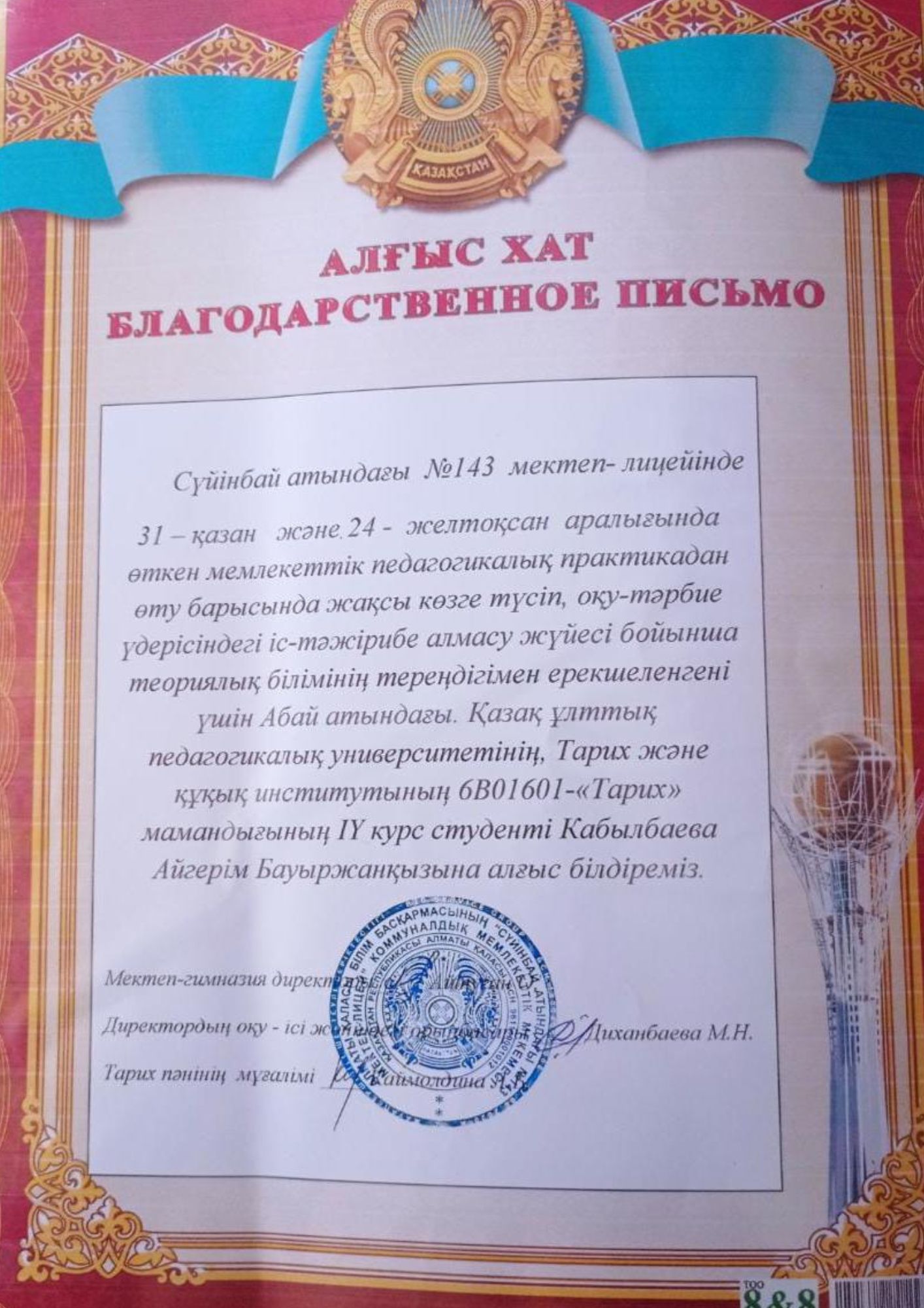 At its core, pedagogical practice is a complex symbiosis of psychology, sociology, pedagogy and many other sciences responsible for human development.During their teaching practice, 3rd-4th year interns under the guidance of the Department of World History took an active part in the social life of their schools. The director of school No. 143 named after Suyunbai expressed gratitude for theoretical knowledge and practical skills during teaching practice to trainees Basereva Laura and Kabylbayeva Aigerim, as well as to all student trainees in organizing and holding a historical decade at school No. 143.The first results are quite positive, but there are still more than 3 months of teaching practice ahead, so I would like to wish all students to continue to carry out the practice program with the same quality and perseverance!