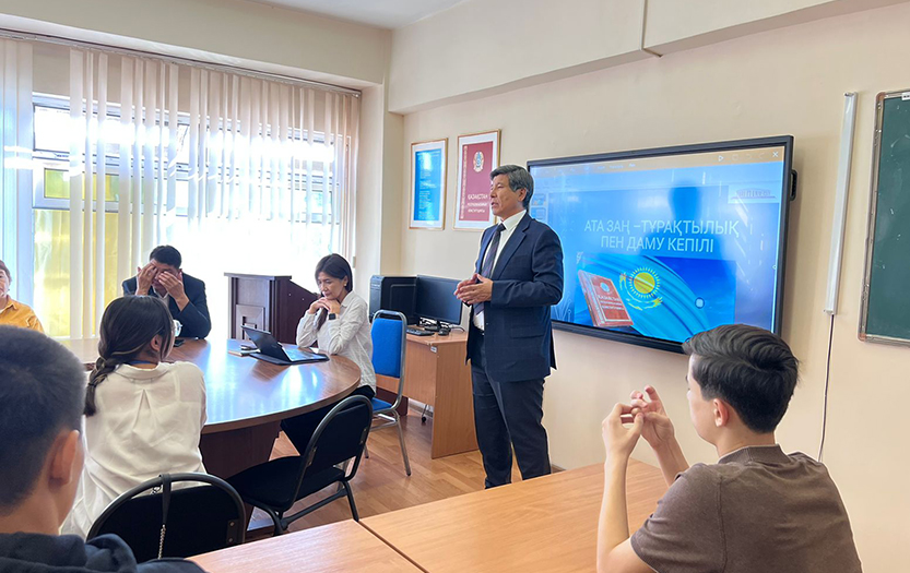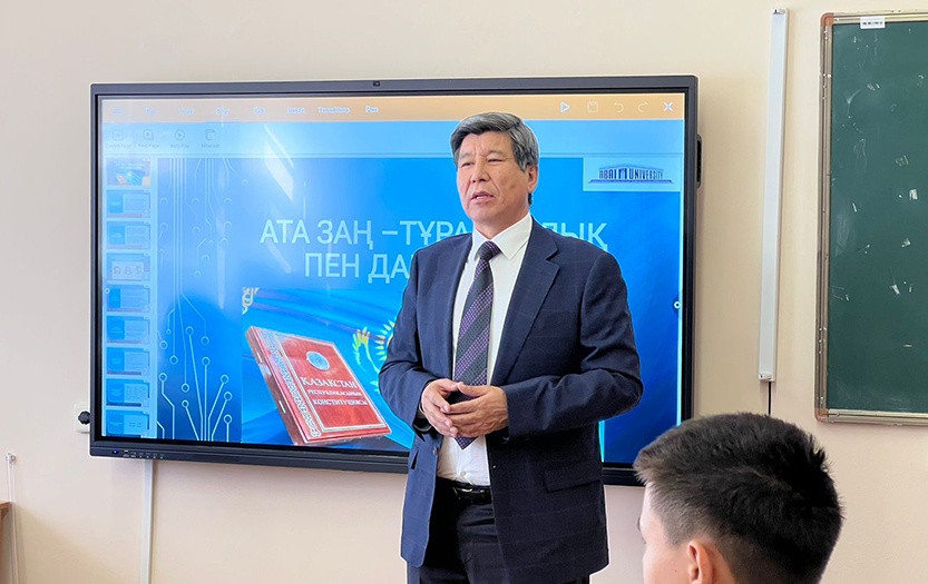 Director of the Institute Gabit Kenzhebaev congratulated students, faculty, staff and invited guests on the 28th anniversary of the Constitution of the country and noted its importance in society. Students of 1-3 courses of the Institute of History and Law asked the speaker questions and received specific answers.