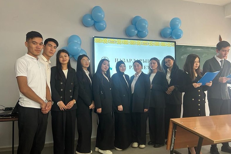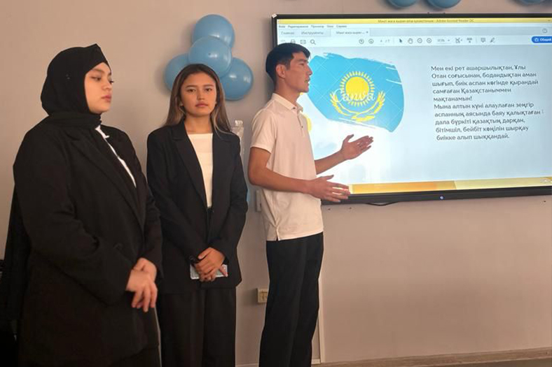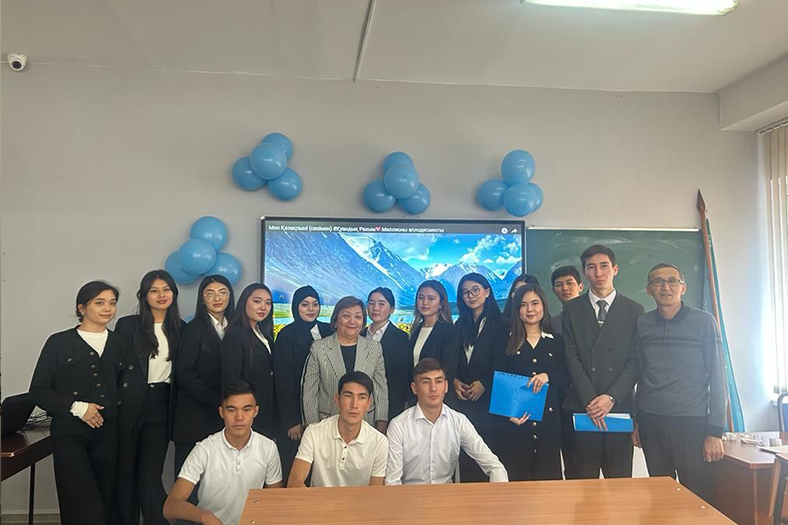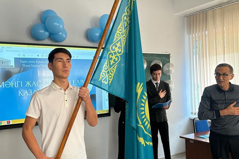 On October 24, 2023, on the occasion of the Day of the Republic, an open hour on the theme "Mangi jasa, kyran elim Kazakhstanim" was held, organised by the students of group 303 of the educational program "History-geography" (Department of World History) of the Institute of History and Law. The evening began with wishes of the deputy director on educational and social work Nurlan Manapov and doctor of historical sciences Khanzada Suteeva. They congratulated students and teachers on the Republic Day. Students spoke about the history of our national symbols and recited poems about the Motherland. The open door hour ended with a patriotic choir of students. The final speech was made by Mereke Tulekova, Doctor of Historical Sciences, and she wished the students success and a bright future.