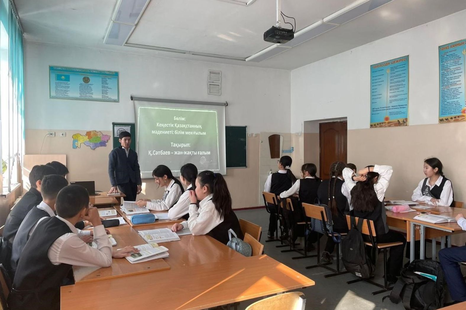An open lesson was held in the 8th grade of Mukangali Magzhan, a 3rd year student of the specialty 6B01601-"History" at the general education school No. 2. Department: Culture of Soviet Kazakhstan: education and science. Topic: Kanysh Satbaev is a versatile scientist, the purpose of the lesson: to evaluate the role of Kanysh Satbaev in the development of the industry and science of Kazakhstan. What is the phenomenon of Kanysh Satbaev? The organization of students through the research question "Kahoot" started by asking for homework. 20th century Kazakh scientists who contributed to literacy in the 20s and 30s wrote additional information about the topic. Opening a new topic, a slide with the "Sanva" platform, and a video clip "Interesting facts about Kanysh Satbayev" analyzed the place of the person in Kazakh history, his biography and his achievements in science, industry and culture. Between the lessons, formative assessment was conducted: handing out chips, group work: "Mystery box", using the "wordwall" platform, 2 groups drew on the provided sheets, "Who is in the lead?" They prepared 5 questions and asked each other. Through the "Educational sticker" method, he revealed what he understood in the lesson, what he did not understand, what he understood in today`s lesson and gave feedback. The lesson reached its goal and passed at its level. Students were able to fully participate in the lesson.