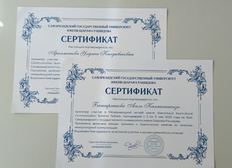 KazNPU Doctoral Students Participated in an International Summer School From May 2 to 8, 2025, first-year doctoral students of the 8D03102 - Cultural Studies program from the Department of Political Science and Socio-Philosophical Disciplines at Abai Kazakh National Pedagogical University, Uldana Aripzhanova and Assel Batyrkhanova, took part in the international summer school "Samarkand Intercultural Communication Summer School", organized by Samarkand State University.