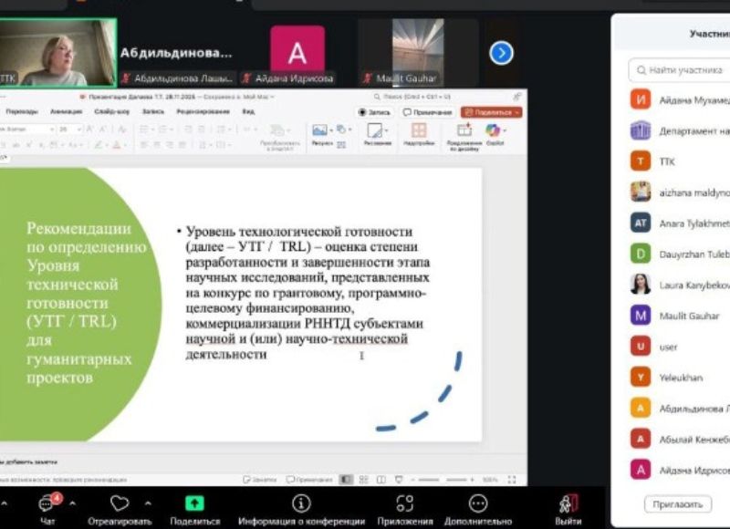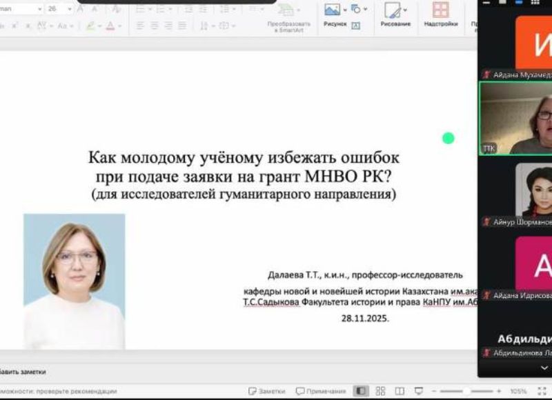 The scientific webinar for young researchers in the humanities On November 28, 2025, a webinar was held on the topic “How Can a Young Scholar Avoid Mistakes When Applying for a Grant from the Ministry of Science and Higher Education of the Republic of Kazakhstan? (For Early-Career Researchers in the Humanities)”. The presentation was delivered by Tenlik Dalayeva, Candidate of Historical Sciences, Professor-Researcher at the Department of Modern and Contemporary History of Kazakhstan named after Academician T.S. Sadykov, Faculty of History and Law. The purpose of the scientific webinar was to provide early-career researchers in the humanities with practical skills for preparing high-quality applications for grant funding from the Ministry of Science and Higher Education of Kazakhstan, with an emphasis on selecting the appropriate grant call and properly substantiating the expected outcomes. Special attention was given to the methodology for determining Technology Readiness Levels (TRLs) in the humanities and social sciences. Recommendations were formulated on how to correctly define TRLs for grant competitions for young researchers in Kazakhstan. Young researchers of Abai KazNPU showed great interest and were actively engaged during the webinar.