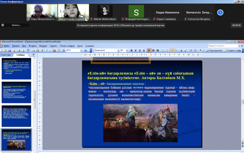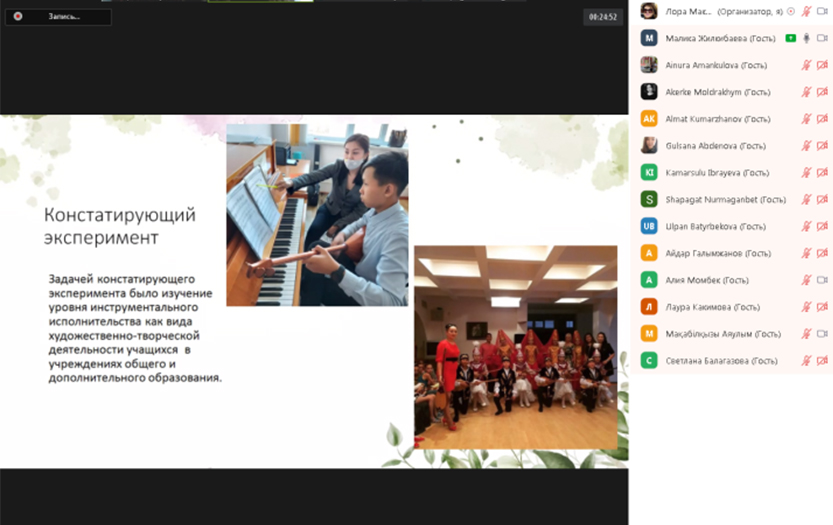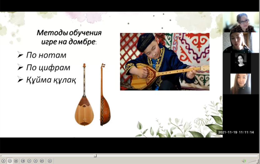 On November 18-19, 2021, the 76th intra-university scientific conference of students and undergraduates was held at the Department of Music Education and Choreography of the Institute of Arts, Culture and Sports. Professor Lora Narikbayeva was the chairman and moderator of the section «Music education and choreography», the secretary of the section was Nurmaganbet Shapagat, a 1st-year master`s student of the educational program «Music Education».