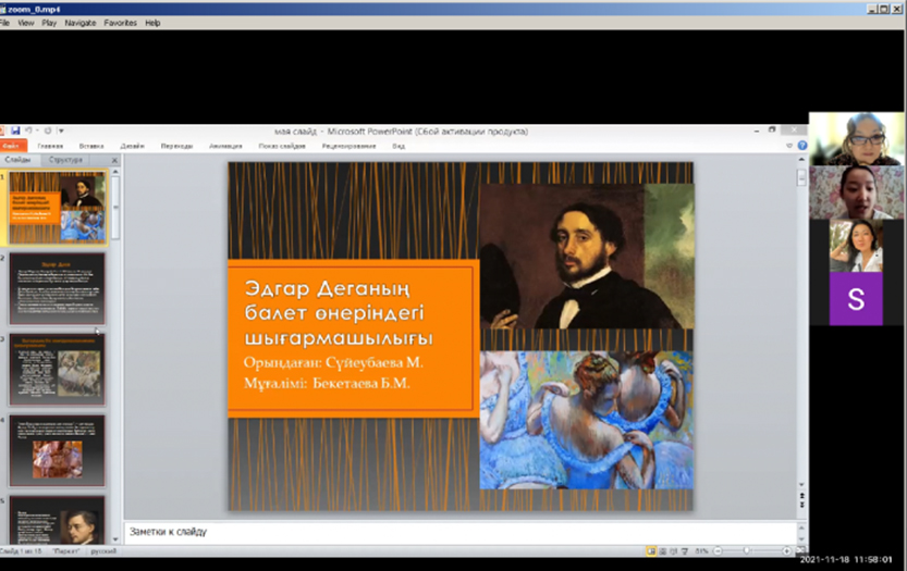 Diplomas of the II degree - two topics: «Studying the influence of creative professions on a person», Indershiyeva Madina, 1st-year student, (academic advisor - teacher Sh.B. Kosikova) and «Ballet art in the works of Edgar Degas», Suibayeva Maygul, 2nd year, (supervisor - master B.M.Beketaeva).