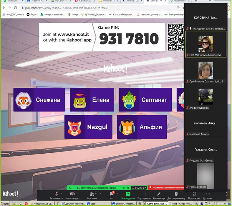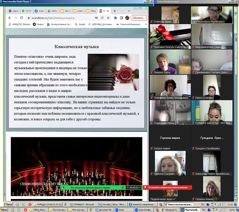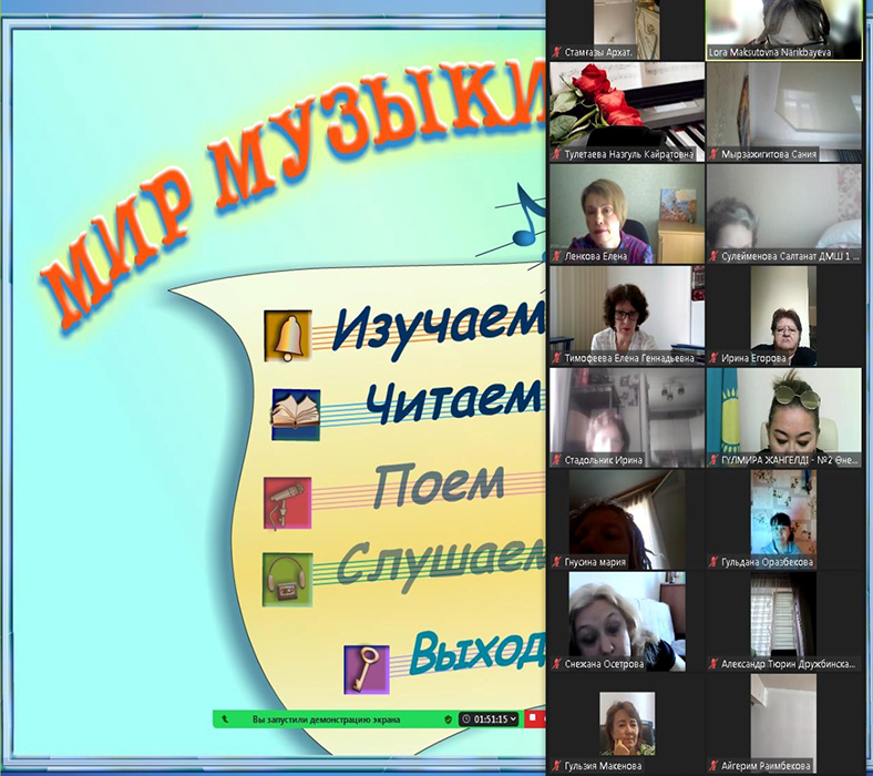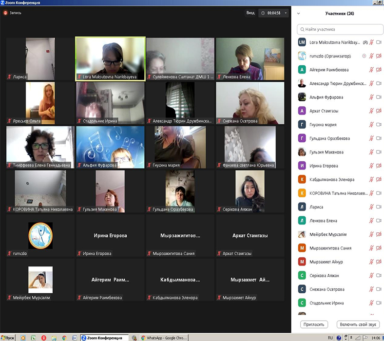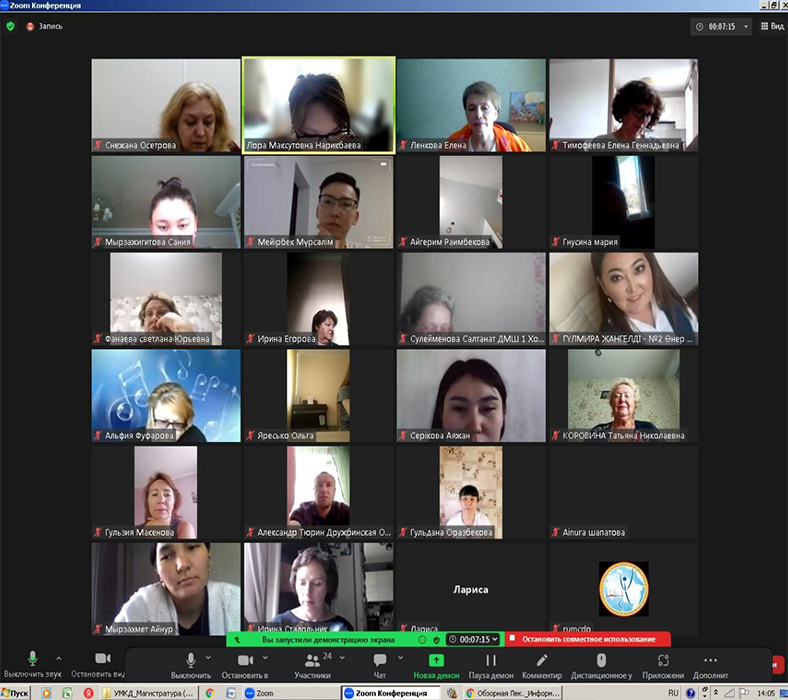 From June 19 to July 1, 2023, Professor of "Music Education and Choreography" Institute of Arts, Culture and Sports of Kazakh National Pedagogical University named after Abay Lora Narikbaeva in online learning mode delivered lectures at the invitation of Republican State Utility Enterprise "National Training and Methodological Center of Supplementary Education" of the Ministry of Education of the RK at the annual national training courses for teachers and professionals on the profile of organizations implementing educational programs of additional education for children in the musical direction. The theme of the course is "Formation of informative and communicative competencies of students in music classes".