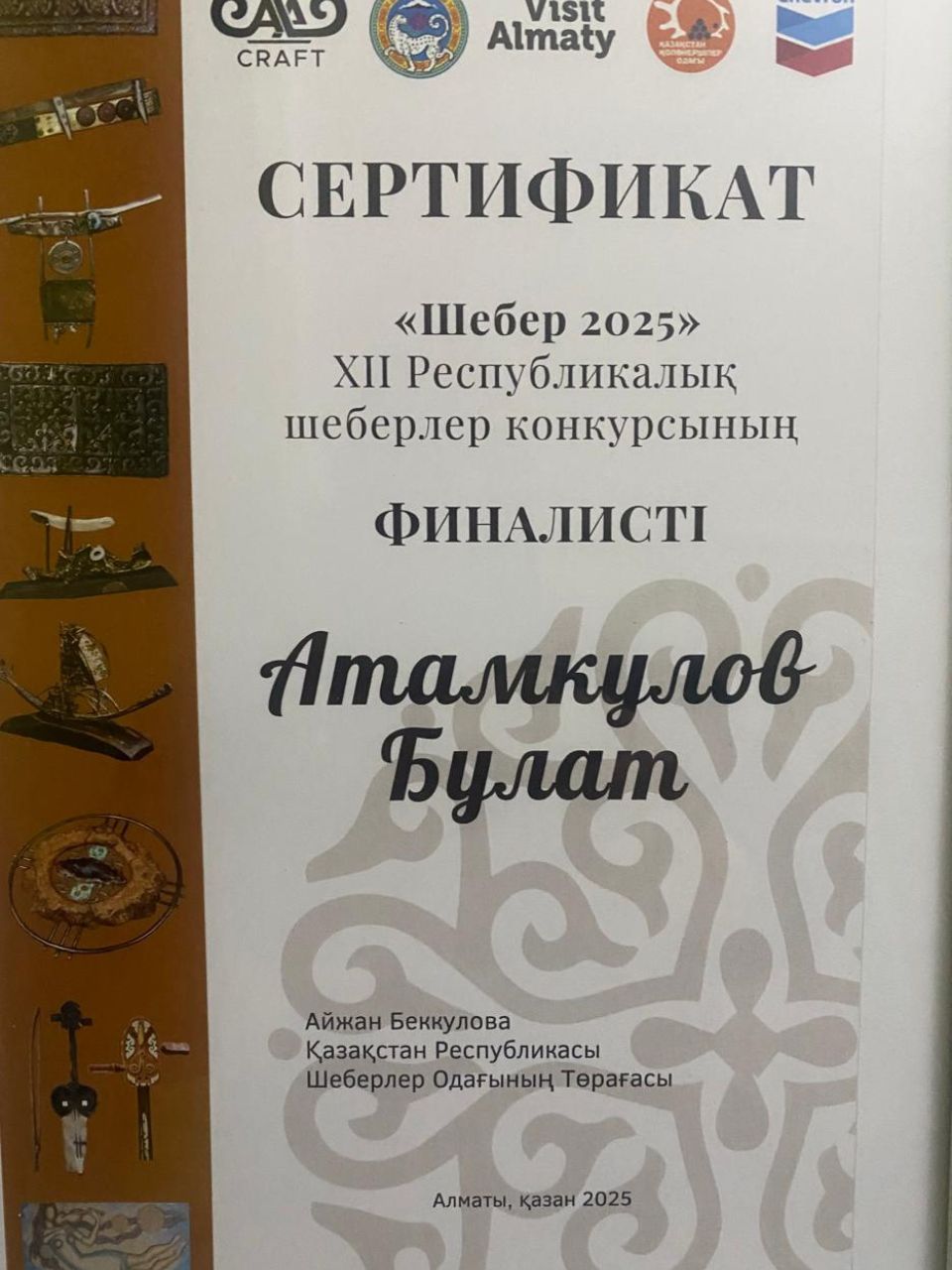 Bulat Atamkulov Akmoldayevich Wins at the XII Republican Craftsmen Competition Design Department lecturer Bulat Atamkulov Akmoldayevich became a finalist of the ~Sheber 2025~ competition and was also recognized as the winner in the ~Murager~ nomination at the XII Republican Craftsmen Competition.