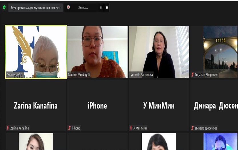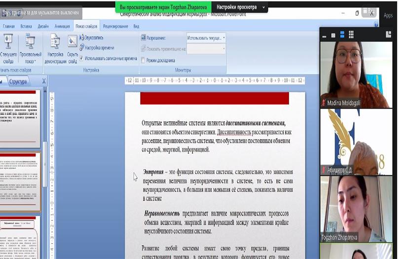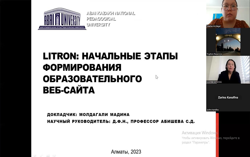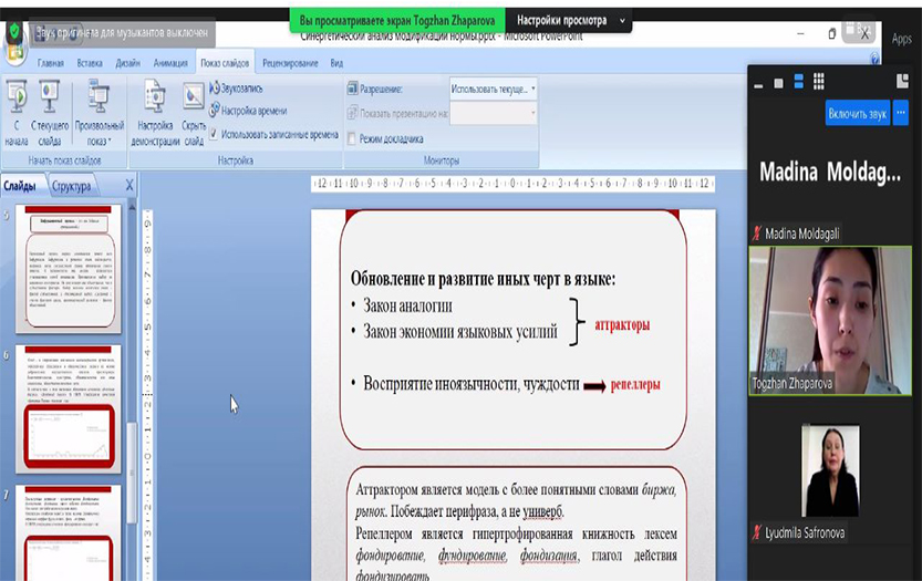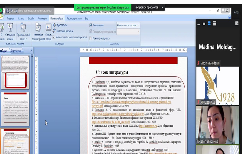 On March 29, 2023, there were organized the scientific seminar in the Department of Russian Language and Literature of the Institute of Philology by Professor L. Safronova. The speakers were the 3rd year doctoral students Togzhan Zhaparova with the topic "Synergetic analysis of the development of borrowed lexemes", the supervisor is Professor Shaibakova D.D., and Madina Moldagali with the topic "Litron: the basic stages of the formation of an educational website", supervisor is Professor Abisheva S.D.