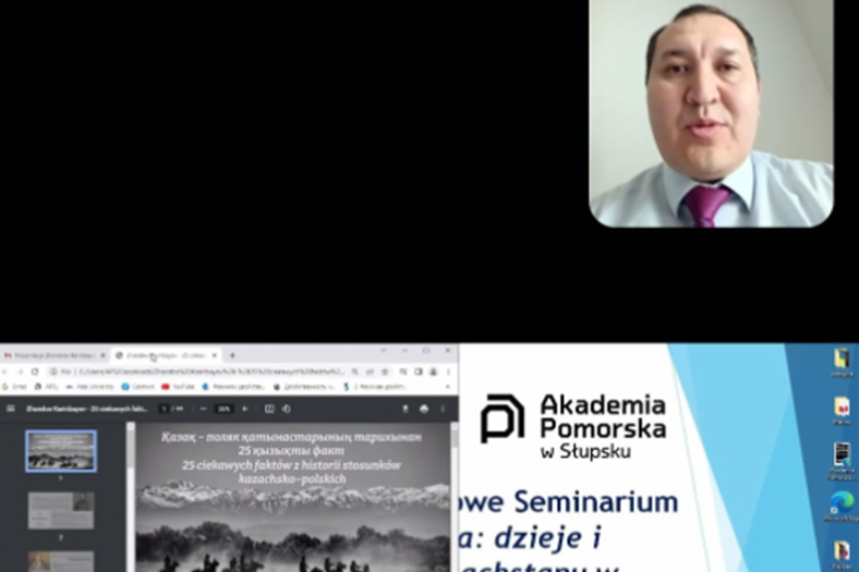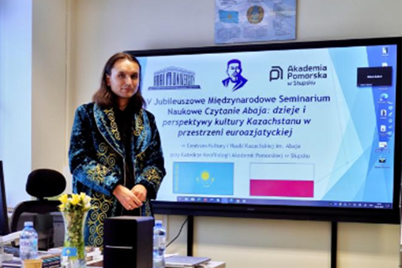 The seminar was organized under the honorary patronage of the Embassy of Kazakhstan in Poland and in cooperation with Abai KazNPU. The seminar was attended by representatives of the diplomatic corps of Kazakhstan: Ms. Ulzhan Galinova, Secretary of the Embassy of Kazakhstan in the Polish Republic, as well as Ms. Zhanna Nasyrova, Director of the Honorary Consulate of the Republic of Kazakhstan in Gdansk. Representatives of Abai KazNPU were also present: Doctor of Philology, Professor Bakhytgul Sakenovna Zhumagulova, candidate of philology sciences, acting associate Professor Akerke Bayanovna Irgebayeva, Master, senior lecturer Bibizhan Parkulovna Abuova and students. The seminar was also attended by Ms. Tatiana Skali, Dean for Cooperation with Universities of the East, representing the Kazakh Cultural Center "Kazak Eli" at the Higher School of Economics in Bydgoszcz. The Pomeranian Academy was represented by the Vice-Rector for Student Affairs, Dr. Hab. Danuta Gierczyńska, AP Professor, Mr. Vice Rector for Science Dr. Dariusz Ficek, AP Professor and Director of the Institute of Philology Dr. hab. Kristina Kravets-Zlotkovskaya. The moderator of the meeting was the coordinator of the center, Dr. Maxim Ponomarenko.